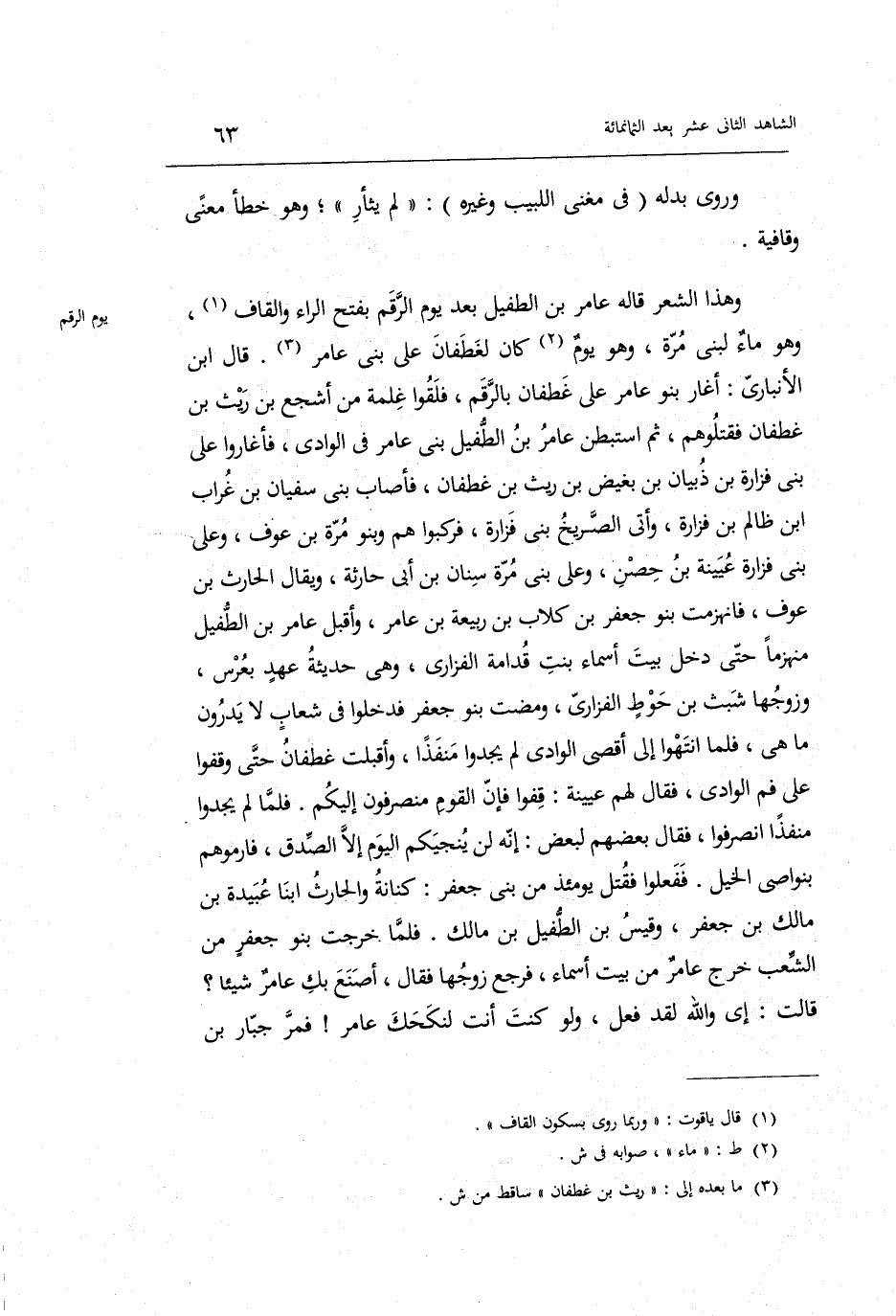 وَهَذَا الشّعْر قَالَه عَامر بن الطُّفَيْل بعد يَوْم الرقم بِفَتْح الرَّاء وَالْقَاف وَهُوَ مَاء لبني مرّة وَهُوَ يَوْم كَانَ لغطفان على بني عَامر.