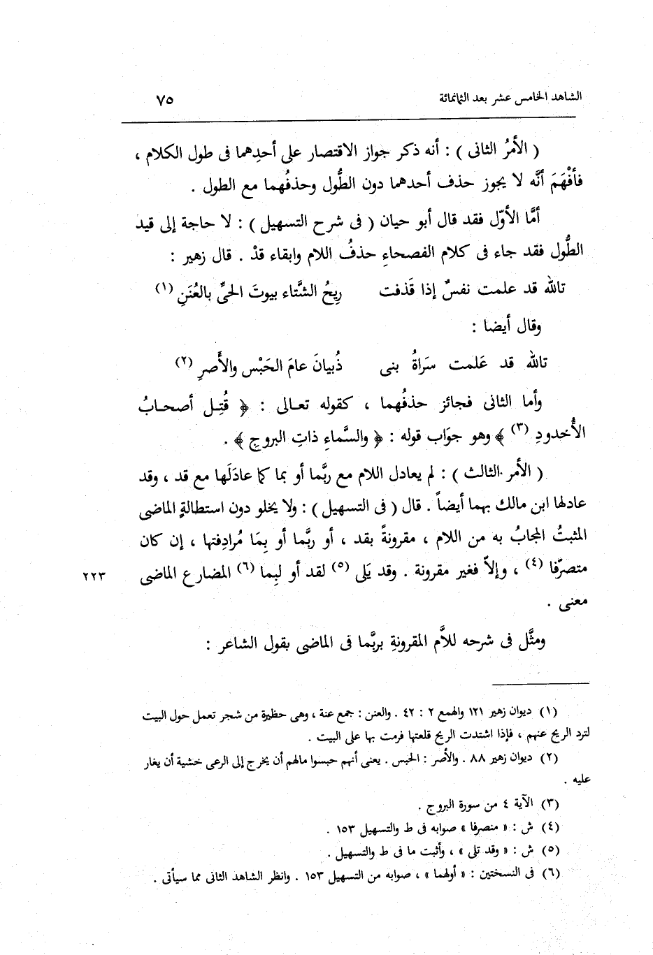 أما الأول فقد قَالَ أَبُو حَيَّان فِي شرح التسهيل: لَا حَاجَة إِلَى قيد الطول فقد جَاءَ فِي كَلَام الفصحاء حذف اللَّام وإبقاء قد.