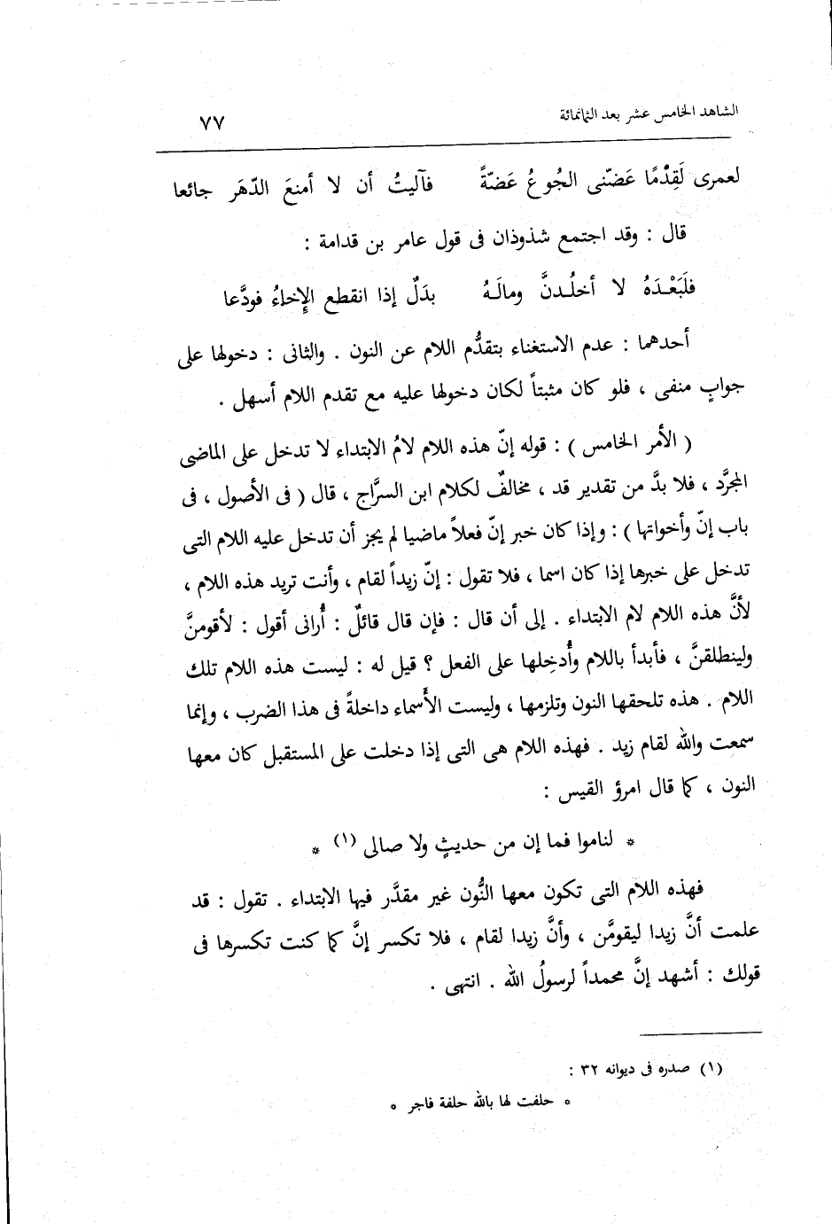 لناموا فَمَا إِن من حَدِيث وَلَا صالي فَهَذِهِ اللَّام الَّتِي تكون مَعهَا النُّون غير مُقَدّر فِيهَا الِابْتِدَاء. تَقول: قد علمت أَن زيدا ليقومن)