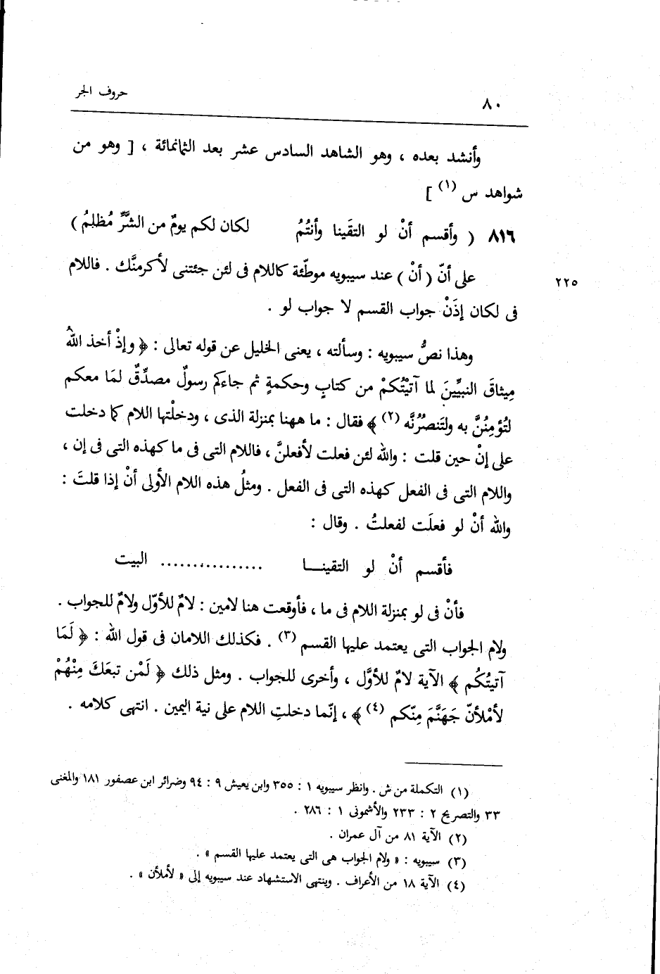 وَهَذَا نَص سِيبَوَيْهٍ: وَسَأَلته يَعْنِي الْخَلِيل عَن قَوْله تَعَالَى: وَإِذ أَخذ الله مِيثَاق النَّبِيين لما آتيتكم من كتاب وَحِكْمَة ثمَّ جَاءَكُم رَسُول مُصدق لما مَعكُمْ لتؤمنن بِهِ ولتنصرنه فَقَالَ: مَا هَاهُنَا بِمَنْزِلَة الَّذِي ودخلتها اللَّام كَمَا فِي إِن وَاللَّام الَّتِي فِي الْفِعْل هُنَا. وَمثل هَذِه اللَّام الأولى أَن إِذا قلت: وَالله أَن لَو فعلت لفَعَلت. وَقَالَ: فأقسم أَن لَو الْتَقَيْنَا ... ... ... ... ... الْبَيْت ف أَن فِي لَو بِمَنْزِلَة اللَّام فِي مَا فأوقعت هُنَا لامين: لَام للْأولِ وَلَام للجواب. وَلَام الْجَواب هِيَ الَّتِي يعْتَمد عَلَيْهَا الْقسم. فَكَذَلِك اللامان فِي قَول الله: لما آتيتكم الْآيَة. لَام للْأولِ وَأُخْرَى للجواب.