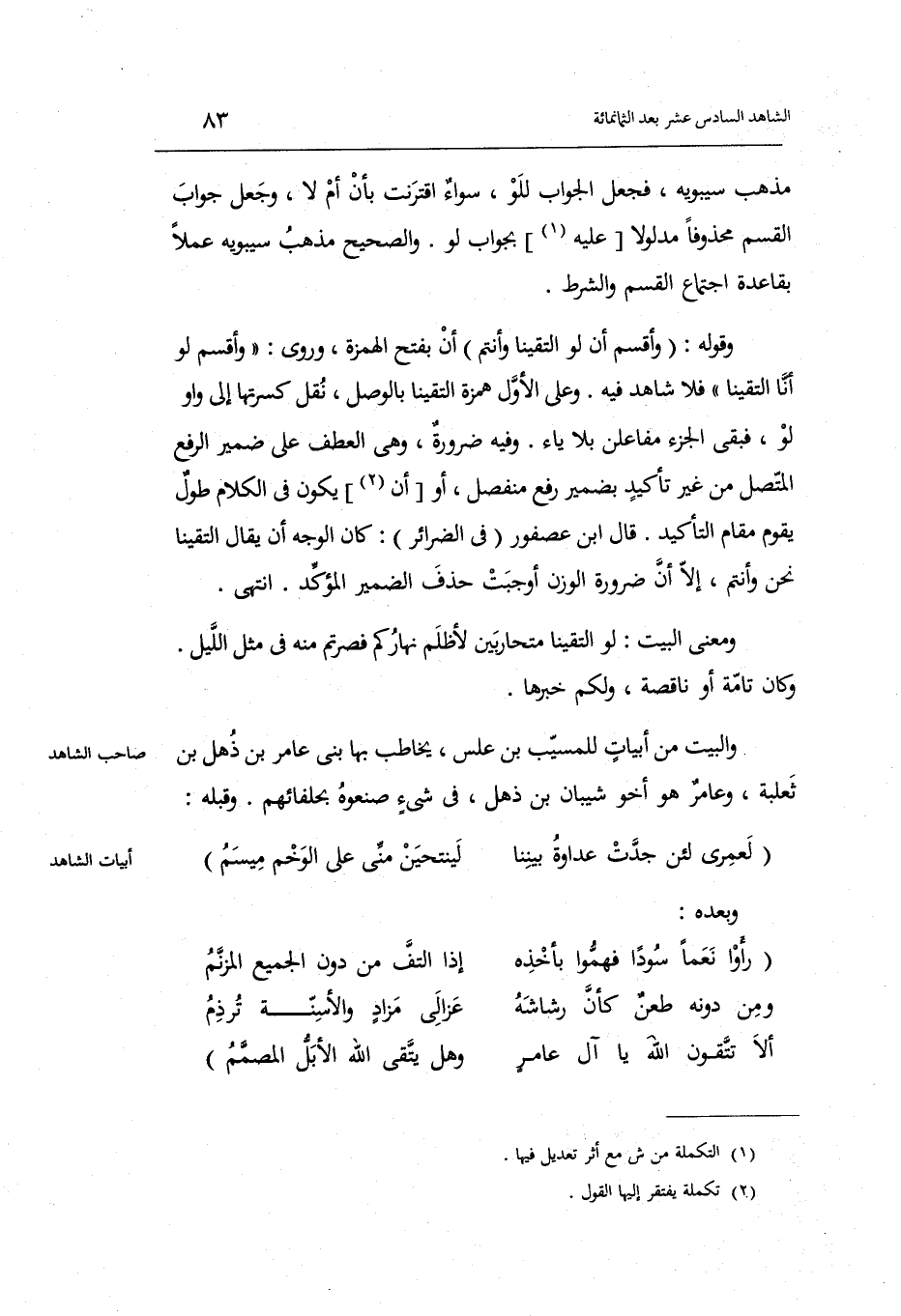 وعَلى الأول همزَة الْتَقَيْنَا بالوصل نقل كسرتها إِلَى وَاو لَو فَبَقيَ الْجُزْء مفاعلن بِلَا يَاء. وَفِيه ضَرُورَة وَهِي الْعَطف على ضمير الرّفْع الْمُتَّصِل من غير تَأْكِيد بضمير رفع مُنْفَصِل أَو أَن يكون فِي الْكَلَام طول يقوم مقَام التَّأْكِيد.