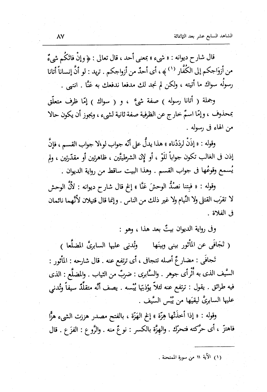 قَالَ شَارِح ديوانه: شَيْء بِمَعْنى أحد قَالَ تَعَالَى: وَإِن فاتكم شَيْء من أزواجكم إِلَى الْكفَّار أَي: أحد من أزواجكم.
