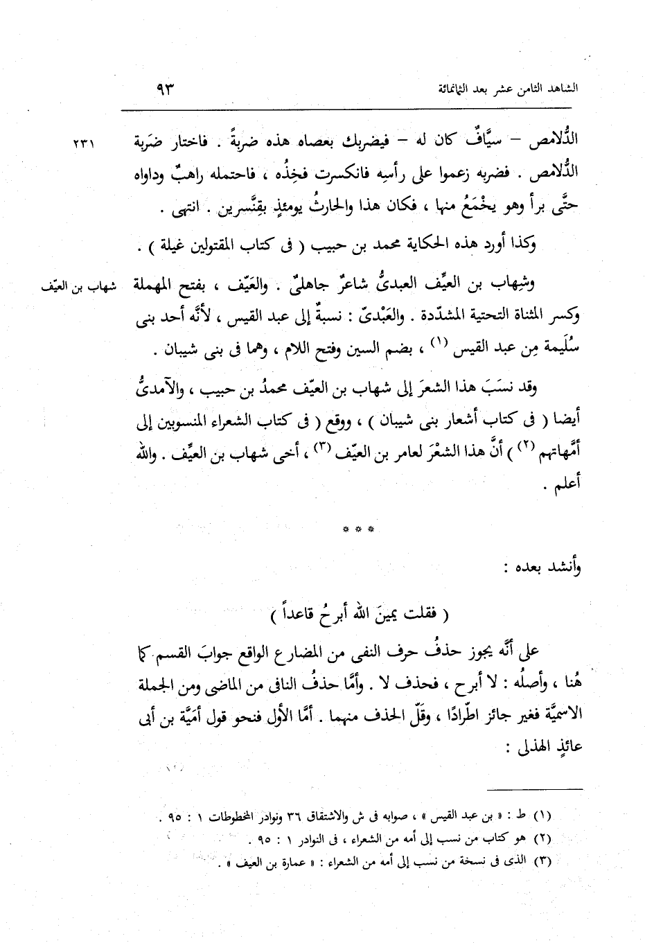 وَقد نسب هَذَا الشّعْر إِلَى شهَاب بن العيف مُحَمَّد بن حبيب والآمدي أَيْضا فِي كتاب أشعار بني شَيبَان وَوَقع فِي كتاب الشُّعَرَاء المنسوبين إِلَى أمهاتهم أَن هَذَا الشّعْر لعامر بن العيف أخي شهَاب بن العيف. وَالله أعلم.