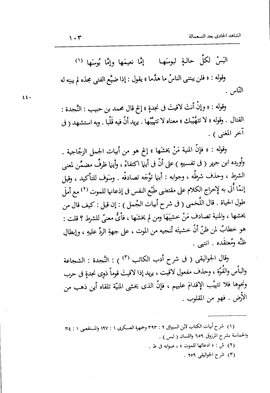 وَقَالَ الجواليقي فِي شرح أدب الْكَاتِب: النجدة: الشجَاعَة والبأس وَالْقُوَّة وَحذف مفعول لاقيت يُرِيد: إِذا لاقيت قوما ذَوي نجدةٍ فِي حَرْب وَنَحْوهَا فَلَا تتهيب الْإِقْدَام عَلَيْهِم فَإِن الَّذِي يخْشَى الْمنية تَلقاهُ أَيْن ذهب من الأَرْض فَهُوَ من المقلوب.