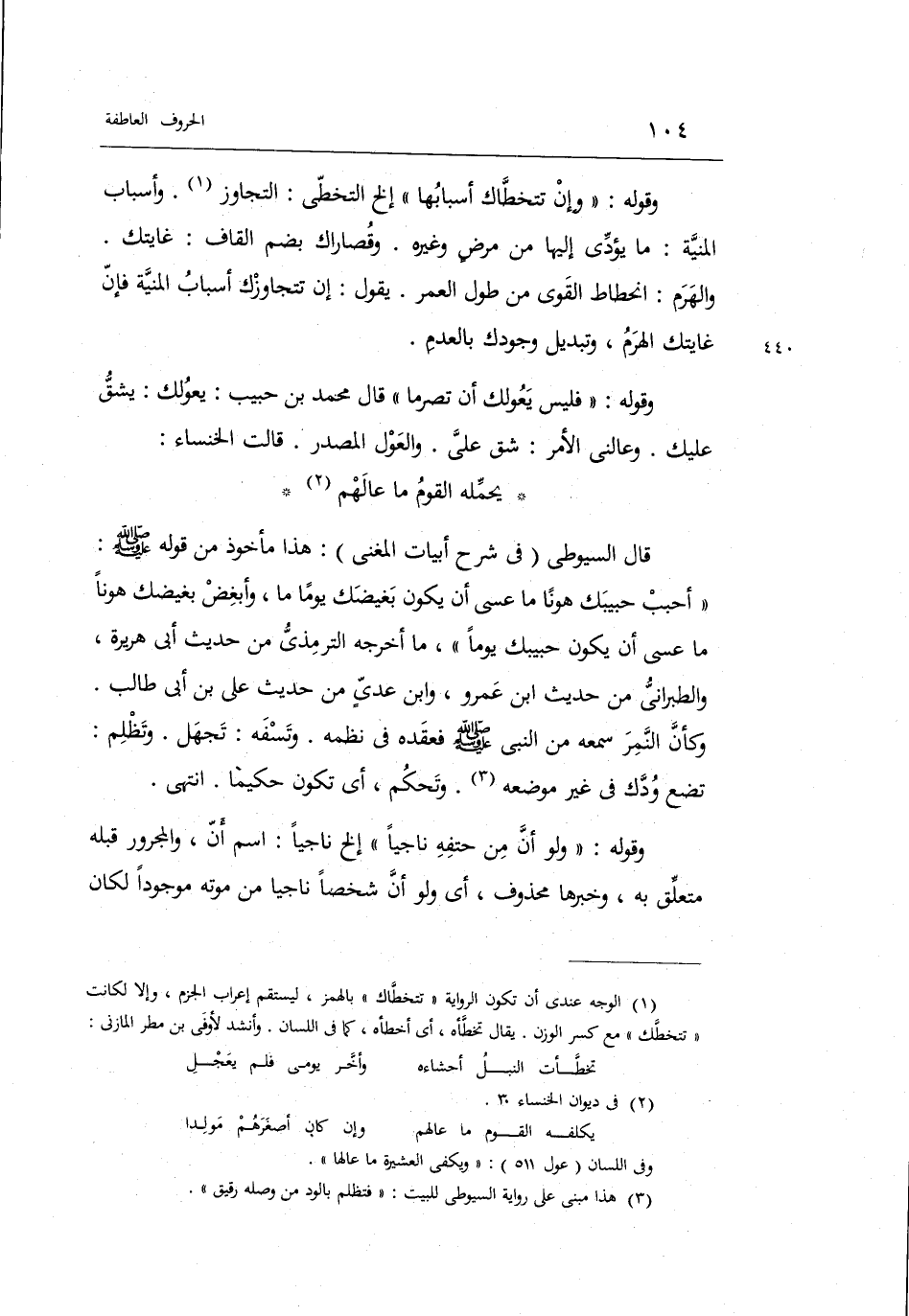 قَالَ الخنساء: المتقارب يحملهُ الْقَوْم مَا عالهم قَالَ السُّيُوطِيّ فِي شرح أَبْيَات الْمُغنِي: هَذَا مَأْخُوذ من قَوْله صَلَّى اللَّهُ عَلَيْهِ وَسَلَّم َ: أحبب حَبِيبك هونا مَا عَسى أَن يكون بَغِيضك يَوْمًا مَا وَأبْغض بَغِيضك هونا مَا عَسى أَن يكون حَبِيبك يَوْمًا مَا أخرجه التِّرْمِذِيّ من حَدِيث أبي هُرَيْرَة وَالطَّبَرَانِيّ من حَدِيث ابْن عَمْرو وَابْن عدي من حَدِيث عَليّ بن أبي طَالب. وَكَأن النمر سَمعه من النَّبِي صَلَّى اللَّهُ عَلَيْهِ وَسَلَّم َ فعقده فِي نظمه.