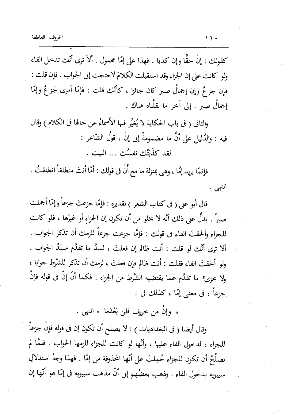 قَالَ أَبُو عَليّ فِي كتاب الشّعْر تَقْدِيره: فإمَّا جزعت جزعاً وَأما أجملت صبرا يدل على ذَلِك أَنه لَا يَخْلُو من أَن تكون إِن الْجَزَاء أَو غَيرهَا فَلَو كَانَت للجزاء وألحقت الْفَاء فِي قَوْلك: فإمَّا أَلا ترى أَنَّك لَو قلت: أَنْت ظَالِم إِن فعلت لسد مَا تقدم مسد الْجَواب وَلَو ألحقت الْفَاء فَقلت أَنْت ظَالِم فَإِن فعلت لزمك أَن تذكر للشّرط جَوَابا وَلَا يجزىء مَا تقدم عَمَّا يَقْتَضِيهِ الشَّرْط من الْجَزَاء.