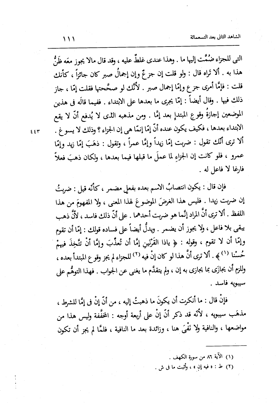 أَلا ترى أَن هَذَا لَو كَانَ إِن فِيهِ للجزاء لم يجز وُقُوع الْمُبْتَدَأ بعده وللزم أَن يجازى بِمَا يجازى بِهِ إِن وَلم يتَقَدَّم مَا يُغني عَن الْجَواب. فَهَذَا التَّوَهُّم على سِيبَوَيْهٍ فَاسد.