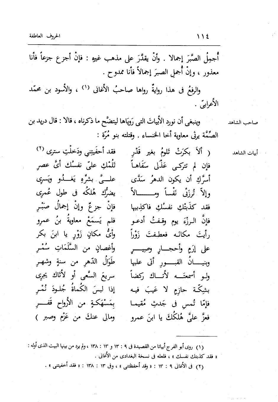 وَيَنْبَغِي أَن نورد الآبيات الَّتِي روياها ليتضح مَا ذَكرْنَاهُ قَالَا: قَالَ دُرَيْد بن الصمَّة يرثي مُعَاوِيَة أَخا الخنساء. وقتلته بَنو مرّة: الوافر