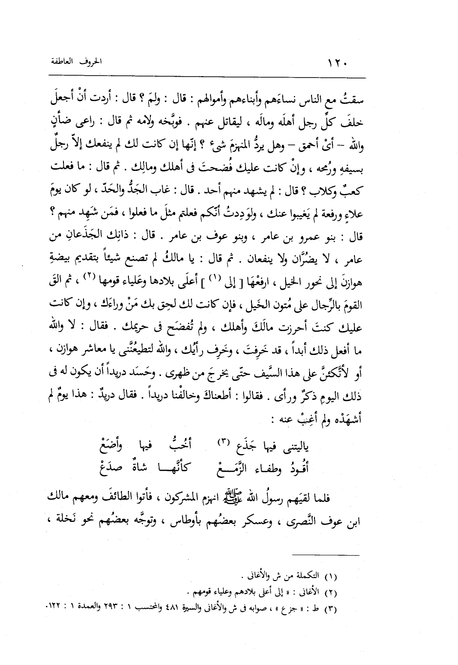 فوبخه ولامه ثمَّ قَالَ: راعي ضَأْن وَالله أَي: أَحمَق وَهل يرد المنهزم شَيْء إِنَّهَا إِن كَانَت لَك لم ينفعك إِلَّا رجل بِسَيْفِهِ وَرمحه وَإِن كَانَت عَلَيْك فضحت فِي أهلك وَمَالك. ثمَّ قَالَ: مَا فعلت كَعْب وكلاب قَالَ: لم يشْهد مِنْهُم أحد. قَالَ: غَابَ الْجد وَالْحَد لَو كَانَ يَوْم عَلَاء ورفعة لم يغيبوا عَنْك ولوددت أَنكُمْ فَعلْتُمْ مثل مَا فعلوا فَمن شهد مِنْهُم قَالَ: بَنو عَمْرو بن عَامر وَبَنُو عَوْف بن عَامر. قَالَ: ذَانك الجذعان من عَامر لَا يضران وَلَا ينفعان. ثمَّ قَالَ: يَا مَالك إِنَّك لم تصنع شَيْئا بِتَقْدِيم الْبَيْضَة بَيْضَة هوزان إِلَى نحور الْخَيل شَيْئا ارفعها إِلَى أَعلَى بلادها