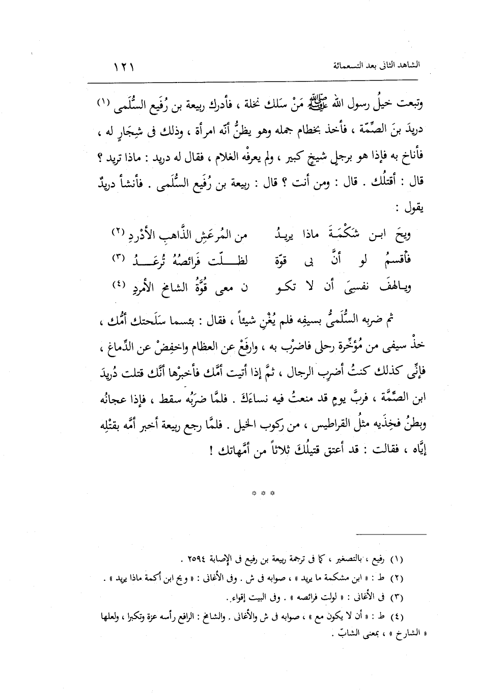وتبعت خيل رَسُول الله صَلَّى اللَّهُ عَلَيْهِ وَسَلَّم َ من سلك نَخْلَة فَأدْرك ربيعَة ابْن رفيع السّلمِيّ دُرَيْد بن الصمَّة فَأخذ بِخِطَام جمله وَهُوَ يظنّ أَنه امْرَأَة وَذَلِكَ أَنه كَانَ فِي شجارٍ لَهُ فَأَنَاخَ بِهِ فَإِذا هُوَ بِرَجُل شيخ كَبِير وَلم يعرفهُ الْغُلَام فَقَالَ لَهُ دُرَيْد: مَاذَا تُرِيدُ قَالَ: أَقْتلك. قَالَ: وَمن أَنْت قَالَ: ربيعَة بن رفيع السّلمِيّ. فأنشاً دُرَيْد يَقُول: المتقارب