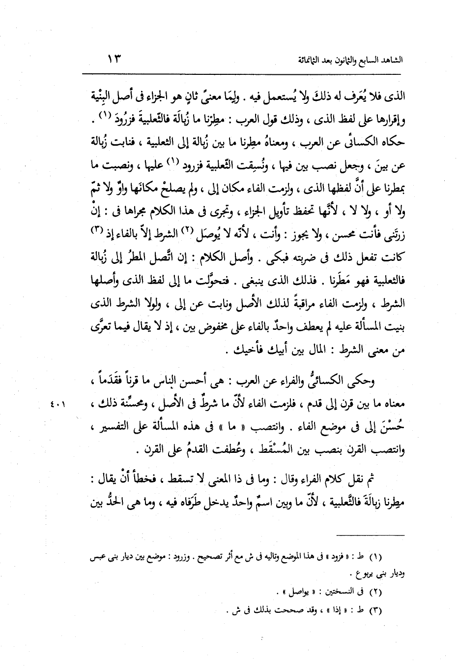 وأصل الْكَلَام: إِن اتّصل الْمَطَر إِلَى زبالة فالثعلبية فَهُوَ مُطِرْنَا فَذَلِك الَّذِي يَنْبَغِي. فتحوّلت مَا إِلَى لفظ الَّذِي وَأَصلهَا الشَّرْط ولزمت الْفَاء مراقبة لذَلِك الأَصْل ونابت عَن إِلَى وَلَوْلَا الشَّرْط الَّذِي بنيت الْمَسْأَلَة عَلَيْهِ لم يعْطف وَاحِد بِالْفَاءِ على مخفوض بَين إِذْ لَا يُقَال فِيمَا تعرّى من معنى الشَّرْط: المَال بَين أَبِيك فأخيك.