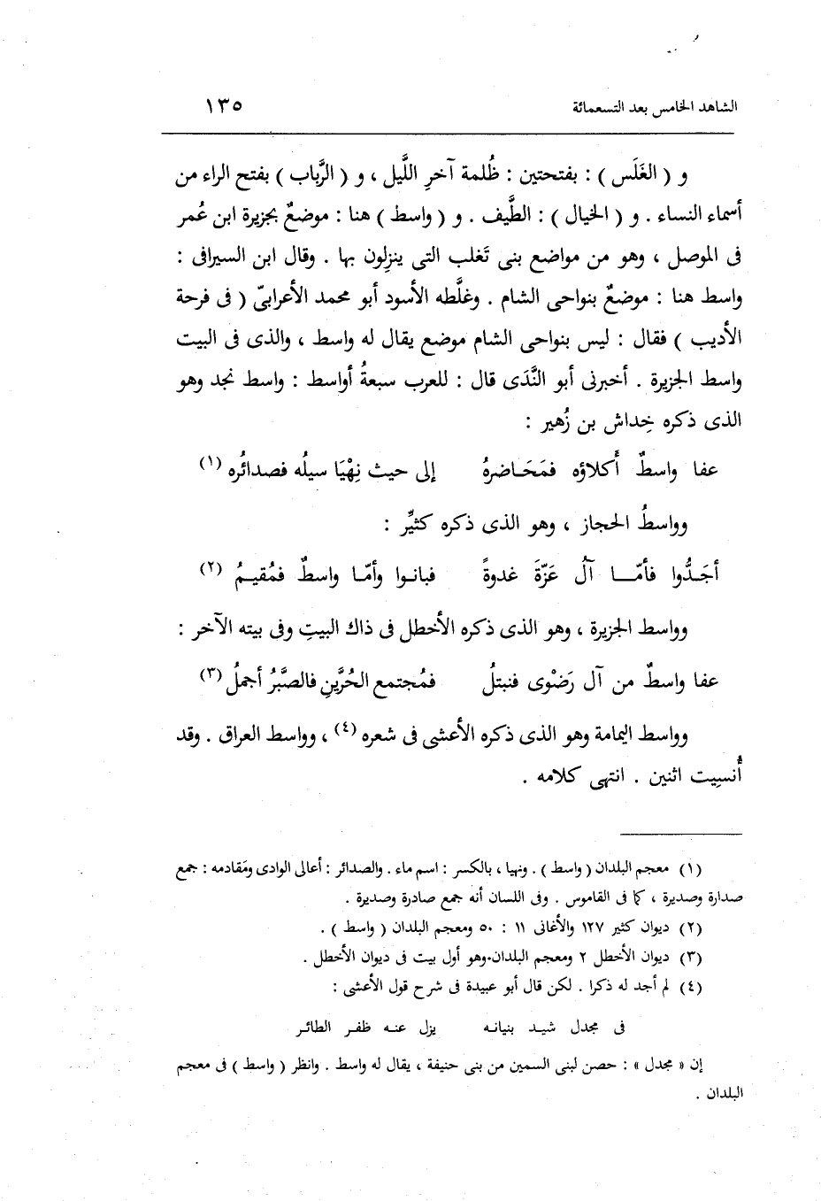 وَقَالَ ابْن السيرافي: وَاسِط هُنَا: مَوضِع بنواحي الشَّام. وغلطه الْأسود أَبُو مُحَمَّد الْأَعرَابِي فِي فرحة الأديب فَقَالَ: لَيْسَ بنواحي الشَّام مَوضِع يُقَال لَهُ: وَاسِط وَالَّذِي فِي الْبَيْت وَاسِط الجزيرة. وَأَخْبرنِي أَبُو الندى قَالَ: للْعَرَب سَبْعَة أواسط: وَاسِط نجد وَهُوَ الَّذِي ذكره خِدَاش بن زُهَيْر: الطَّوِيل