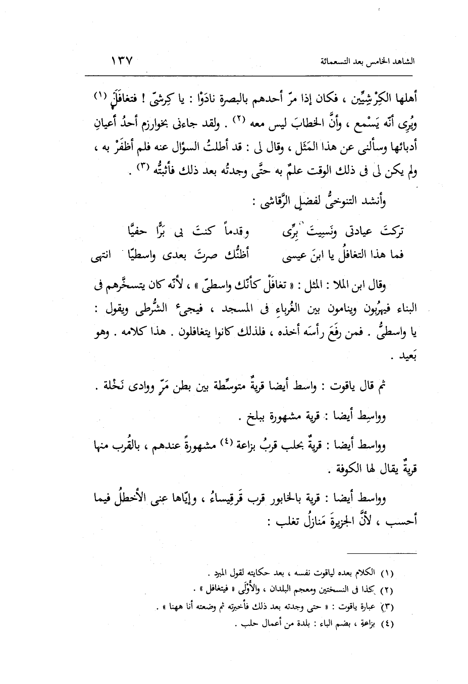 أَعْيَان أدبائها وسألني عَن هَذَا الْمثل وَقَالَ لي: قد أطلت السُّؤَال عَنهُ فَلم أظفر بِهِ وَلم يكن لي فِي ذَلِك الْوَقْت علم بِهِ حَتَّى وجدته بعد ذَلِك فأثبته.