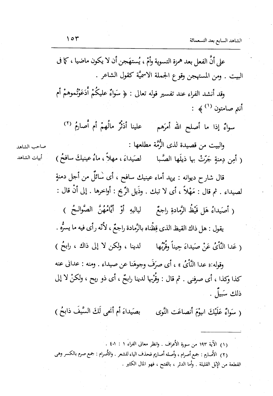 وَقد أنْشدهُ الْفراء عِنْد تَفْسِير قَوْله تَعَالَى: سواءٌ عَلَيْكُم أدعوتموهم أم أَنْتُم صامتون.