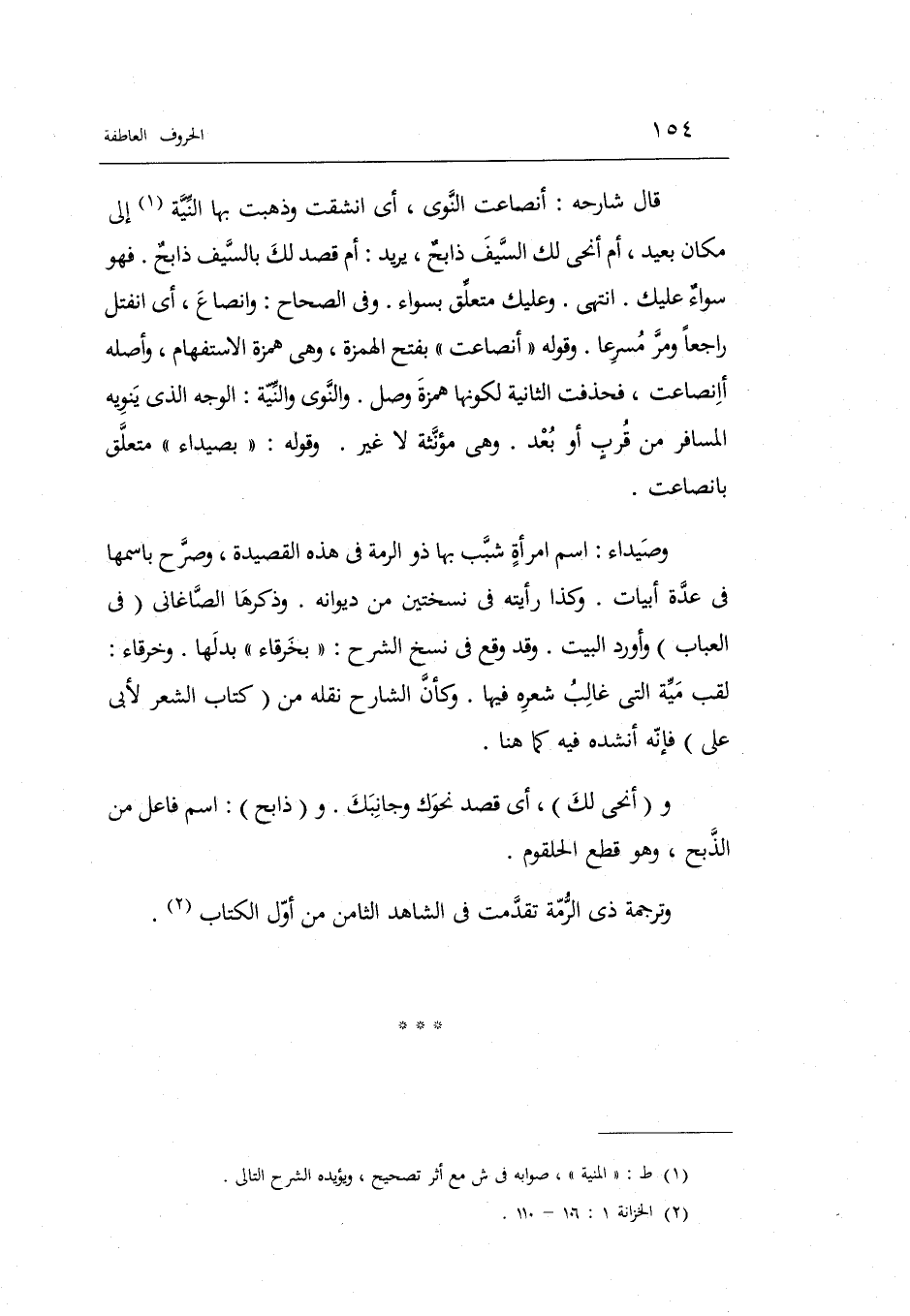 قَالَ شَارِحه: أنصاعت النّوى أَي: انشقت وَذَهَبت بهَا النّيّة إِلَى مَكَان بعيد أم أنحى لَك السَّيْف ذابح يُرِيد: أم قصد لَك بِالسَّيْفِ ذابح. فَهُوَ سَوَاء عَلَيْك. انْتهى.
