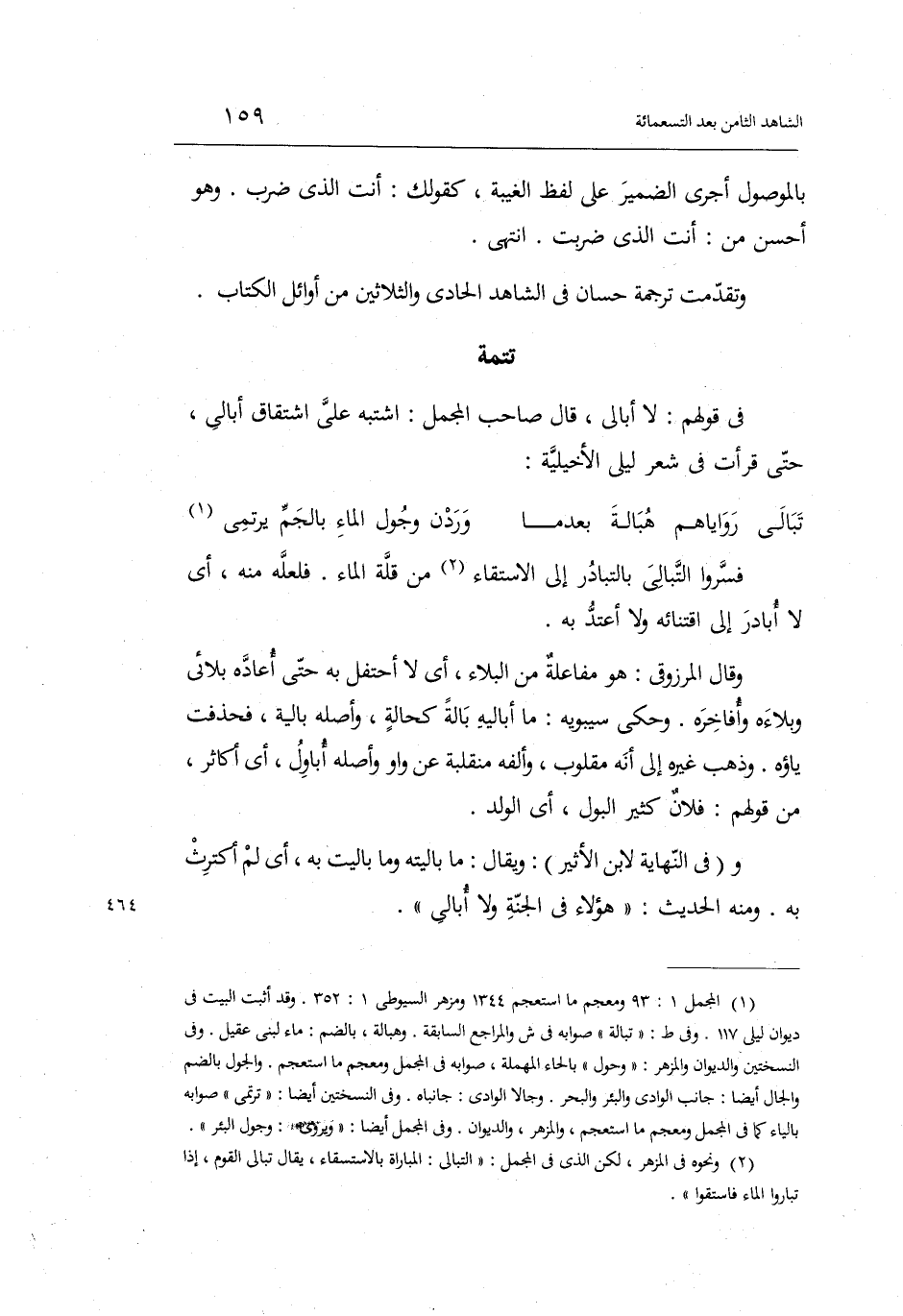 فِي قَوْلهم: لَا أُبَالِي قَالَ صَاحب الْمُجْمل: اشْتبهَ عَليّ اشتقاق أُبَالِي حَتَّى قَرَأت فِي سعر ليلى الأخيلية: الطَّوِيل