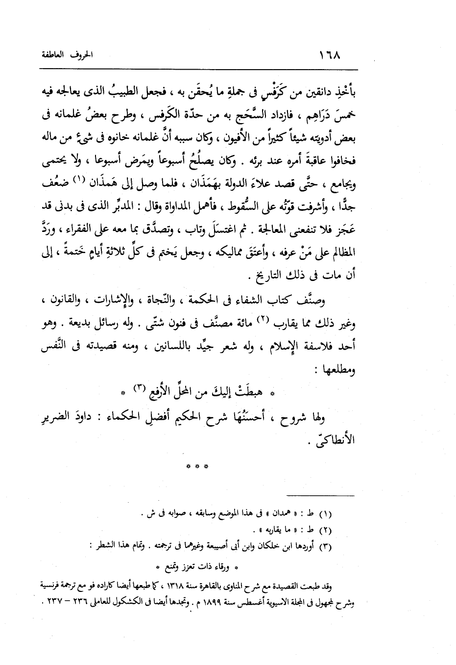 وصنف كتاب الشِّفَاء فِي الْحِكْمَة والنجاة والإشارات والقانون وَغير ذَلِك مَا يُقَارب مائَة مُصَنف فِي فنون شَتَّى. وَله رسائل بديعة وَهُوَ أحد فلاسفة الْإِسْلَام وَله شعر جيد باللسانين وَمِنْه قصيدته فِي النَّفس ومطلعها: الْكَامِل