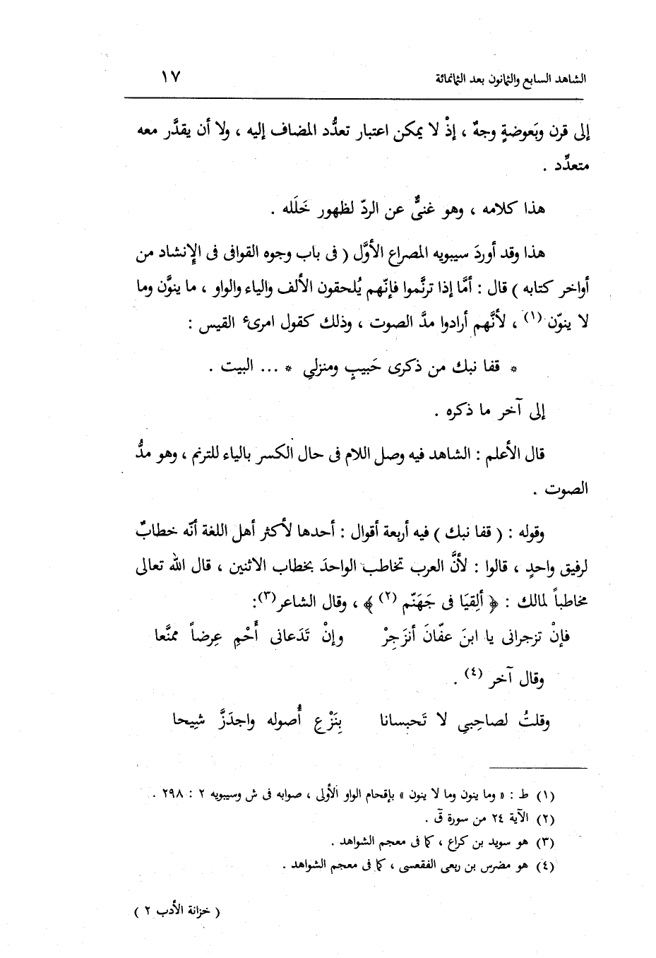 هَذَا وَقد أورد سِيبَوَيْهٍ المصراع الأول فِي بَاب وُجُوه القوافي فِي الإنشاد من أَوَاخِر كِتَابه قَالَ: أما إِذا ترنّموا فَإِنَّهُم يلحقون الْألف وَالْيَاء وَالْوَاو مَا ينوّن وَمَا لَا ينوّن لأَنهم أَرَادوا مدّ الصَّوْت وَذَلِكَ كَقَوْل امرىء الْقَيْس: قفا نبك من ذكرى حبيب ومنزلي الْبَيْت إِلَى آخر مَا ذكره.