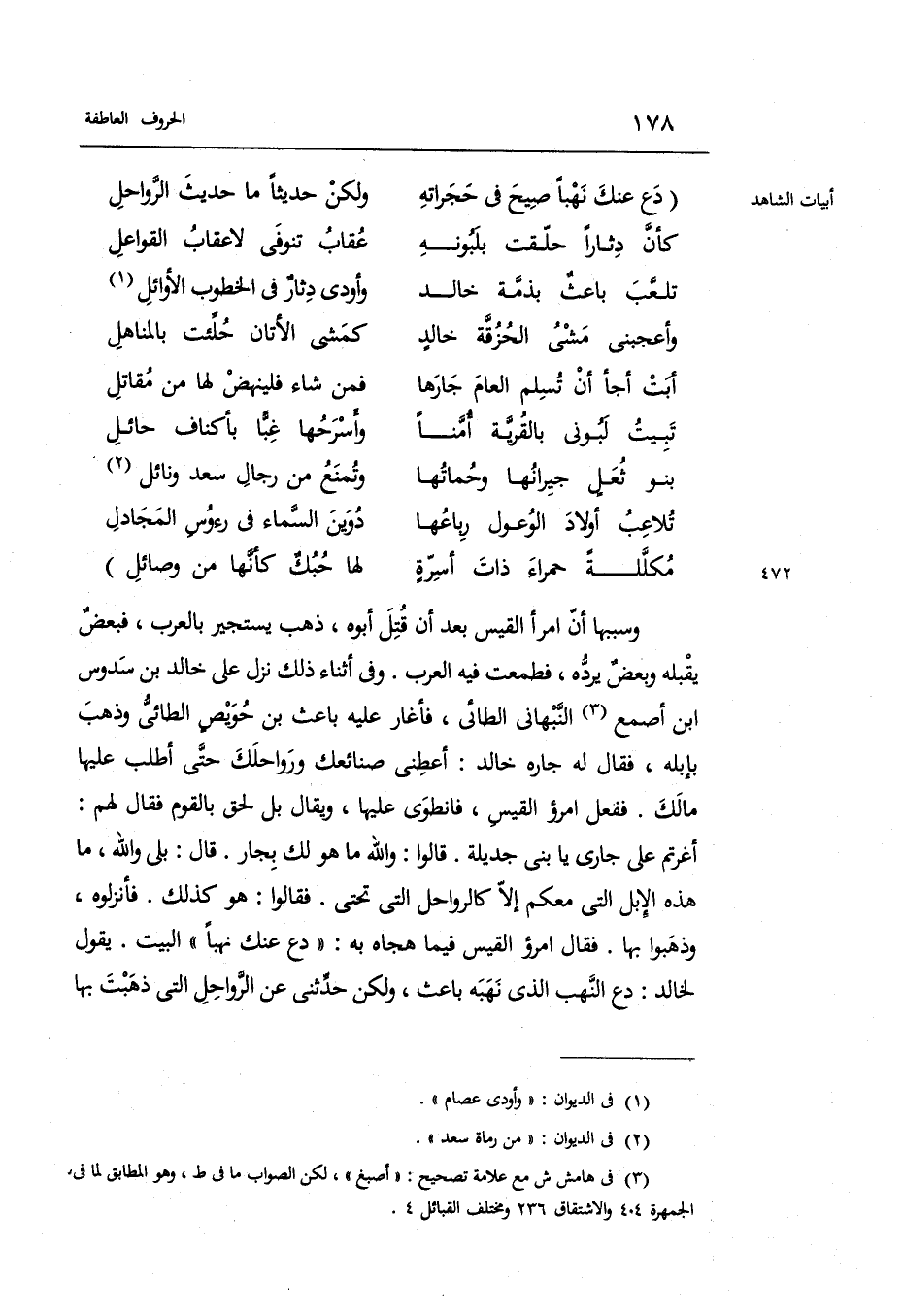 فَقَالُوا: هُوَ كَذَلِك. فأنزلوه وذهبوا بهَا فَقَالَ امْرُؤ الْقَيْس فِيمَا هجاه بِهِ: دع عَنْك نهباً الْبَيْت يَقُول لخَالِد: دع النهب الَّذِي نهبه باعث وَلَكِن حَدثنِي عَن الرَّوَاحِل الَّتِي ذهبت بهَا