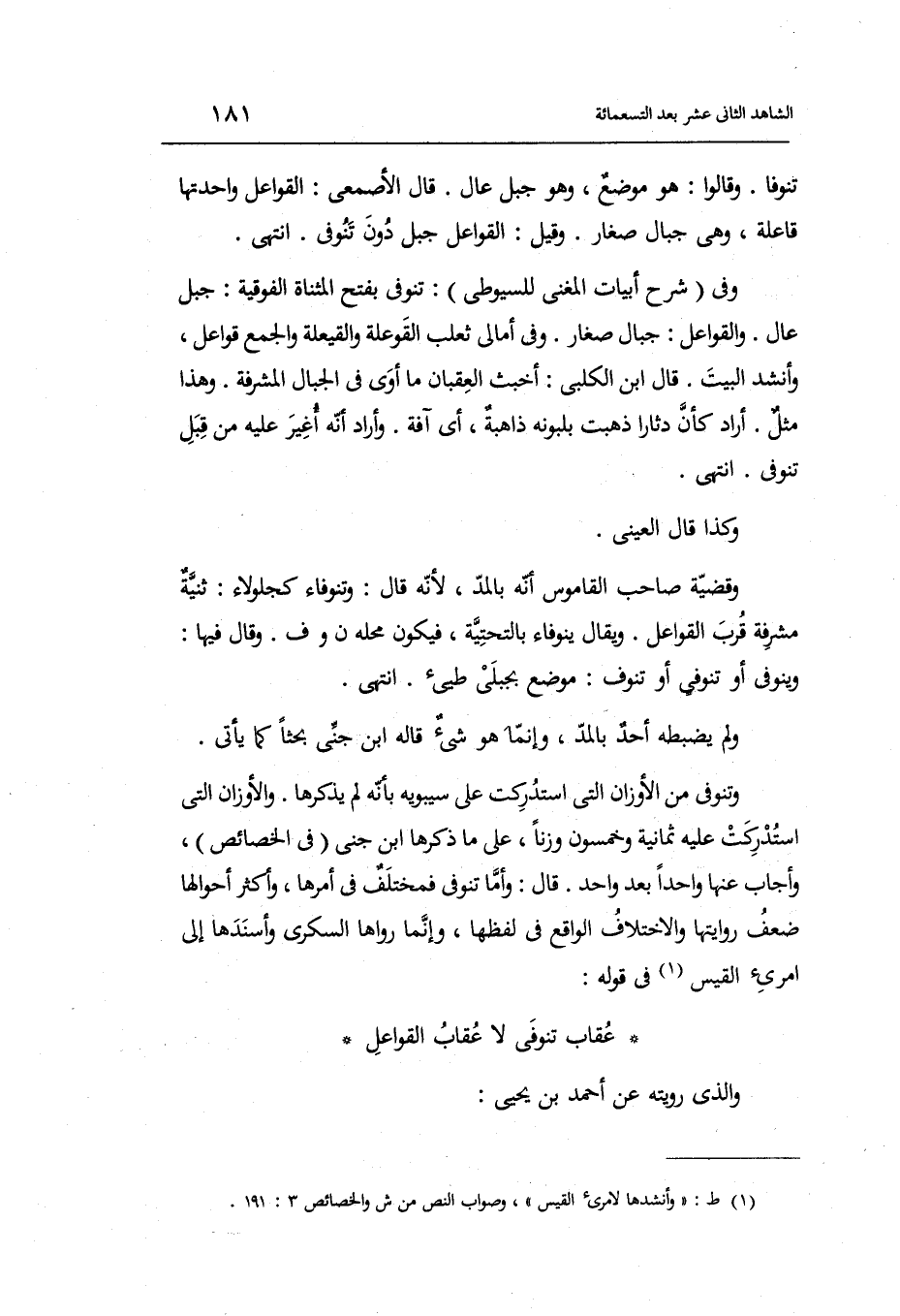 قَالَ: وَأما تنوفى فمختلف فِي أمرهَا وَأكْثر أحوالها ضعف رِوَايَتهَا وَالِاخْتِلَاف الْوَاقِع فِي لَفظهَا وَإِنَّمَا رَوَاهَا السكرِي وأسندها إِلَى امْرِئ الْقَيْس فِي قَوْله: عِقَاب تنوفى لَا عِقَاب القواعل وَالَّذِي رويته عَن أَحْمد بن يحيى: