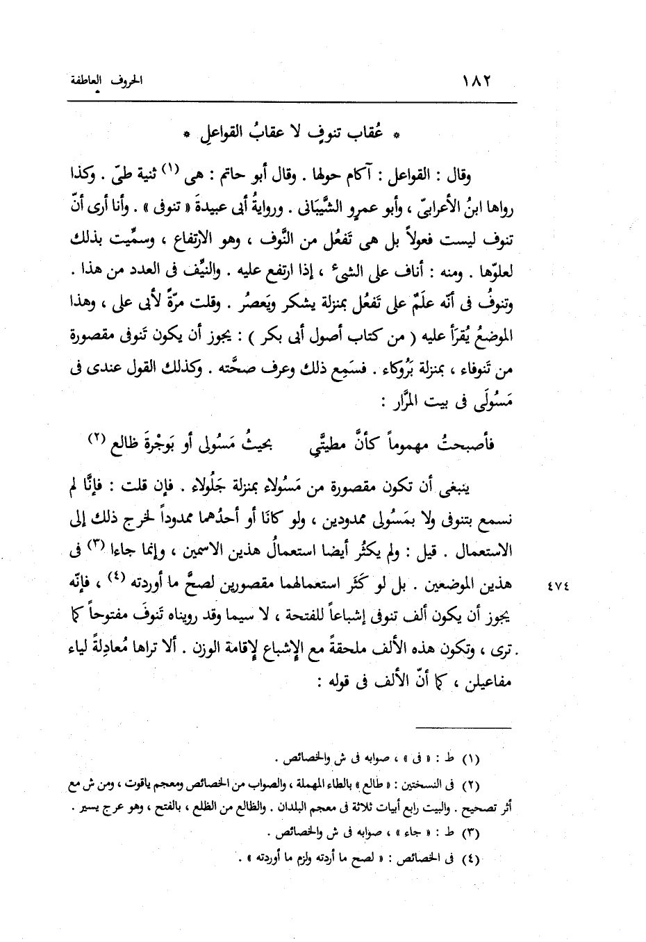 قيل: وَلم يكثر أَيْضا اسْتِعْمَال هذَيْن الاسمين وأنما جَاءَا فِي هذَيْن الْمَوْضِعَيْنِ. بل لَو كثر استعمالهما مقصورين لصَحَّ مَا أوردته فَإِنَّهُ يجوز أَن يكون ألف تنوفى إشباعاً للفتحة لَا سِيمَا وَقد روينَاهُ تنوف مَفْتُوحًا مَا ترى وَتَكون هَذِه الْألف مُلْحقَة مَعَ الإشباع لإِقَامَة الْوَزْن.