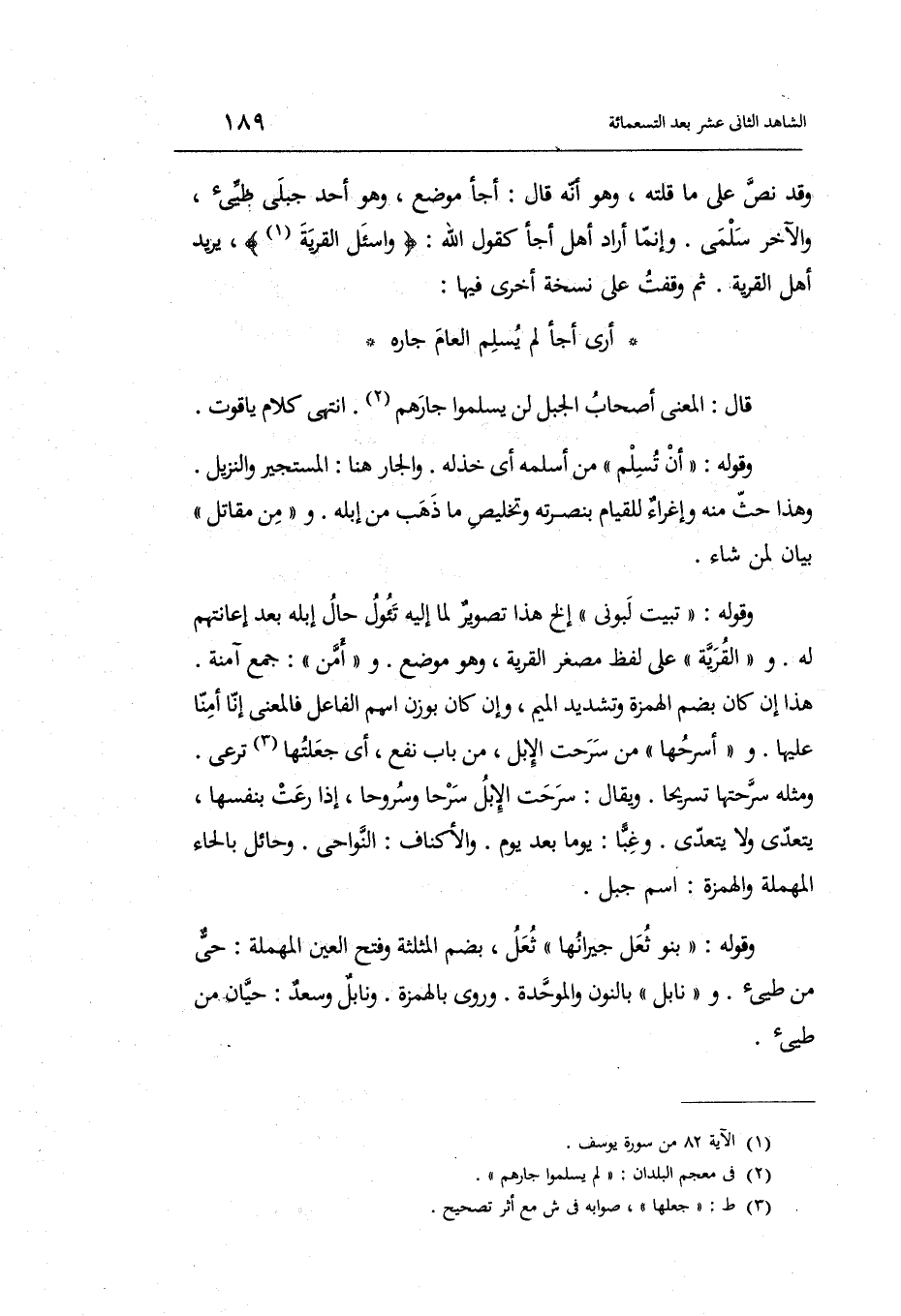 وَقد نَص على مَا قلته وَهُوَ أَنه قَالَ: أجأ مَوضِع وَهُوَ أجد جبلي طَيء وَالْآخر سلمى. وَإِنَّمَا أَرَادَ أهل أجأ كَقَوْل الله: واسئل الْقرْيَة يُرِيد: أهل الْقرْيَة. ثمَّ وقفت على نُسْخَة أُخْرَى فِيهَا: أرى أجأ لم يسلم الْعَام جَاره قَالَ: الْمَعْنى أَصْحَاب الْجَبَل لن يسلمُوا جارهم. انْتهى كَلَام ياقوت.