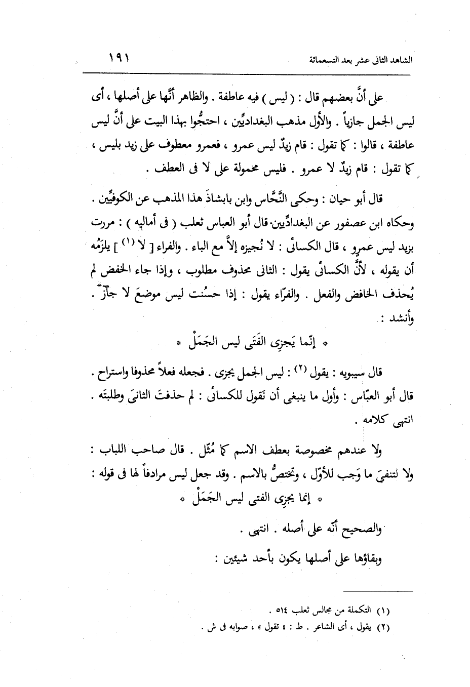 وَالْأول مَذْهَب البغداديين احتجّوا بِهَذَا الْبَيْت على أنّ لَيْسَ عاطفة قَالُوا: كَمَا تَقول: قَامَ زيد لَيْسَ عَمْرو فعمرو مَعْطُوف على زيد بليس كَمَا تَقول: قَامَ زيد لَا عَمْرو. فَلَيْسَ مَحْمُولَة على لَا فِي الْعَطف.
