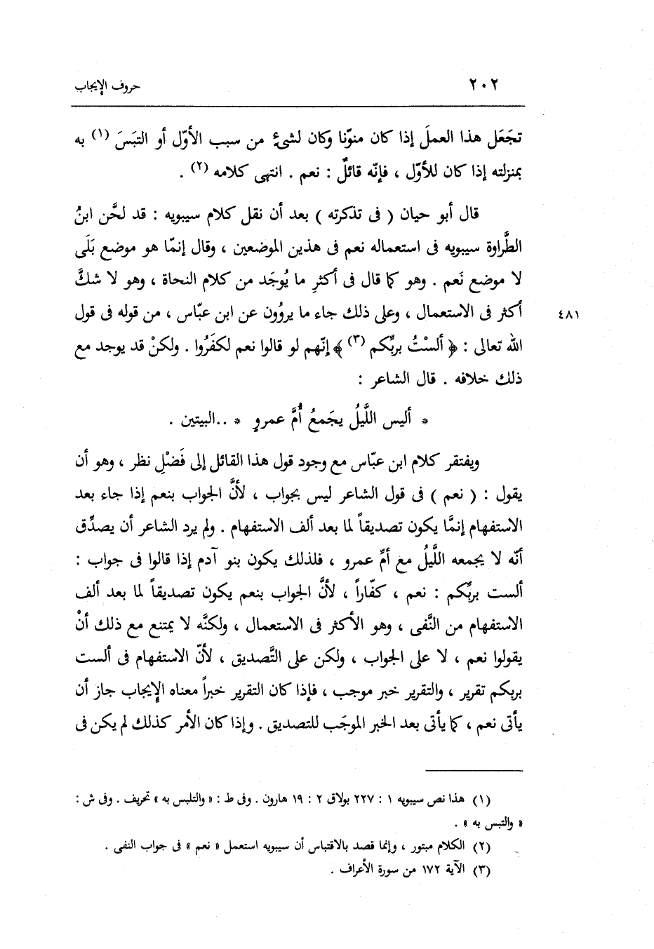 قَالَ الشَّاعِر: أَلَيْسَ اللّيل يجمع أمّ عمرٍ والْبَيْتَيْنِ ويفتقر كَلَام ابْن عَبَّاس مَعَ وجود قَول هَذَا الْقَائِل إِلَى فضل نظر وَهُوَ أَن يَقُول: نعم فِي قَول الشَّاعِر لَيْسَ بِجَوَاب لِأَن الْجَواب ب نعم إِذا جَاءَ بعد الِاسْتِفْهَام إِنَّمَا يكون تَصْدِيقًا لما بعد ألف وَلم يرد الشَّاعِر أَن يصدّق أَنه لَا يجمعه اللَّيْل مَعَ أمّ عَمْرو فَلذَلِك يكون بَنو آدمٍ إِذا قَالُوا فِي جَوَاب: أَلَسْت بربّكم: نعم كفّاراً لِأَن الْجَواب بنعم يكون تَصْدِيقًا لما بعد ألف الِاسْتِفْهَام من النَّفْي وَهُوَ الْأَكْثَر فِي الِاسْتِعْمَال وَلكنه لَا يمْتَنع مَعَ ذَلِك أَن يَقُولُوا: نعم لَا على الْجَواب وَلَكِن على التَّصْدِيق لِأَن الِاسْتِفْهَام فِي أَلَسْت