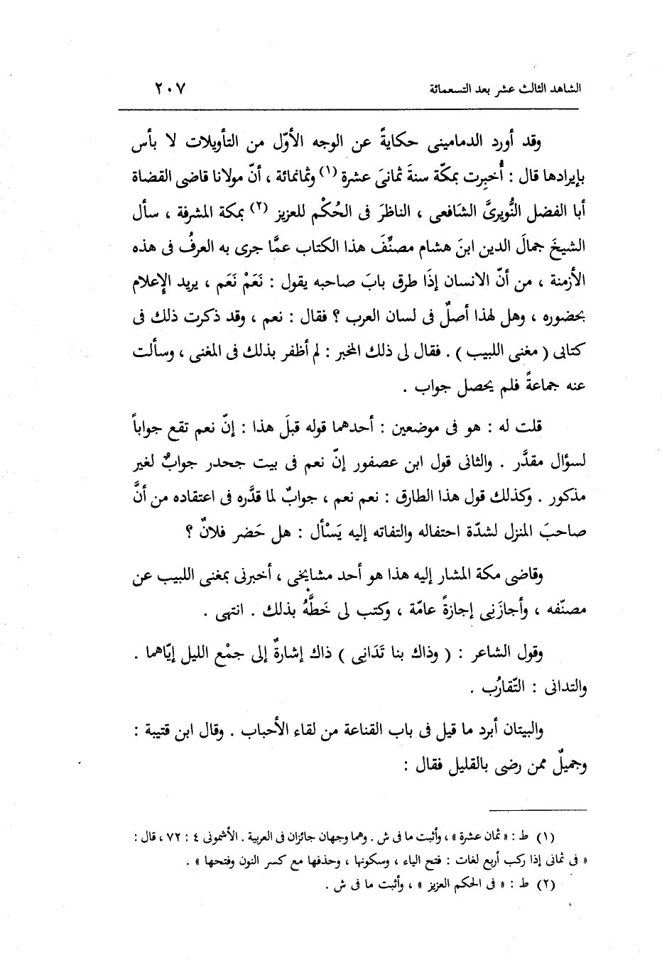 النويري الشَّافِعِي النَّاظر فِي الحكم للعزيز بِمَكَّة المشرفة سَأَلَ الشَّيْخ جمال الدَّين ابْن هِشَام مُصَنف هَذَا الْكتاب عَمَّا جرى بِهِ الْعرف فِي هَذِه الْأَزْمِنَة من أَن الْإِنْسَان إِذا طرق بَاب صَاحبه يَقُول: نعم نعم يُرِيد الْإِعْلَام بِحُضُورِهِ وَهل لهَذَا أصل فِي لِسَان الْعَرَب فَقَالَ: نعم وَقد ذكرت ذَلِك فِي كتابي مُغنِي اللبيب. فَقَالَ لي ذَلِك الْمخبر: لم أظفر بذلك فِي الْمُغنِي وَسَأَلت عَنهُ جمَاعَة فَلم يحصل جَوَاب.