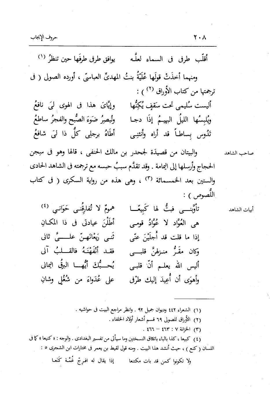 ومنهما أخذت قَوْلهَا عَلَيْهِ بنت الْمهْدي العباسي أوردهُ الصولي فِي ترجمتها من كتاب الأوراق: الطَّوِيل
