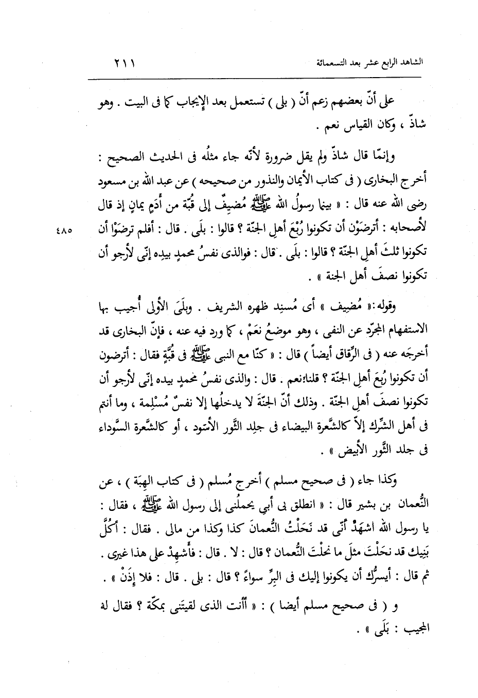 فَقَالَ: أَتَرْضَوْنَ أَن تَكُونُوا ربع أهل الْجنَّة قُلْنَا: نعم. قَالَ: وَالَّذِي نفس مُحَمَّد بِيَدِهِ إِنِّي لأرجو أَن تَكُونُوا نصف أهل الْجنَّة. وَذَلِكَ أَن الْجنَّة لَا يدخلهَا إِلَّا نفس مسلمة وَمَا أَنْتُم فِي أهل الشّرك إِلَّا كالشعرة الْبَيْضَاء فِي جلد الثور الْأسود أَو كالشعر السَّوْدَاء فِي جلد الثور الْأَبْيَض.