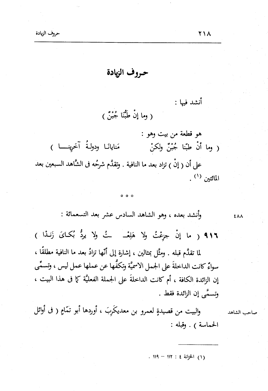 وَمثل بمثالين إِشَارَة إِلَى أَنَّهَا تزاد بعد مَا النافية مُطلقًا سَوَاء كَانَت الدَّاخِلَة على الْجُمْلَة الأسمية وتكفها عَن عَملهَا عمل لَيْسَ وَتسَمى إِن الزَّائِدَة الكافة أم كنت الدَّاخِلَة على الْجُمْلَة الفعلية كَمَا فِي هَذَا الْبَيْت وَتسَمى إِن الزَّائِدَة فَقَط.
