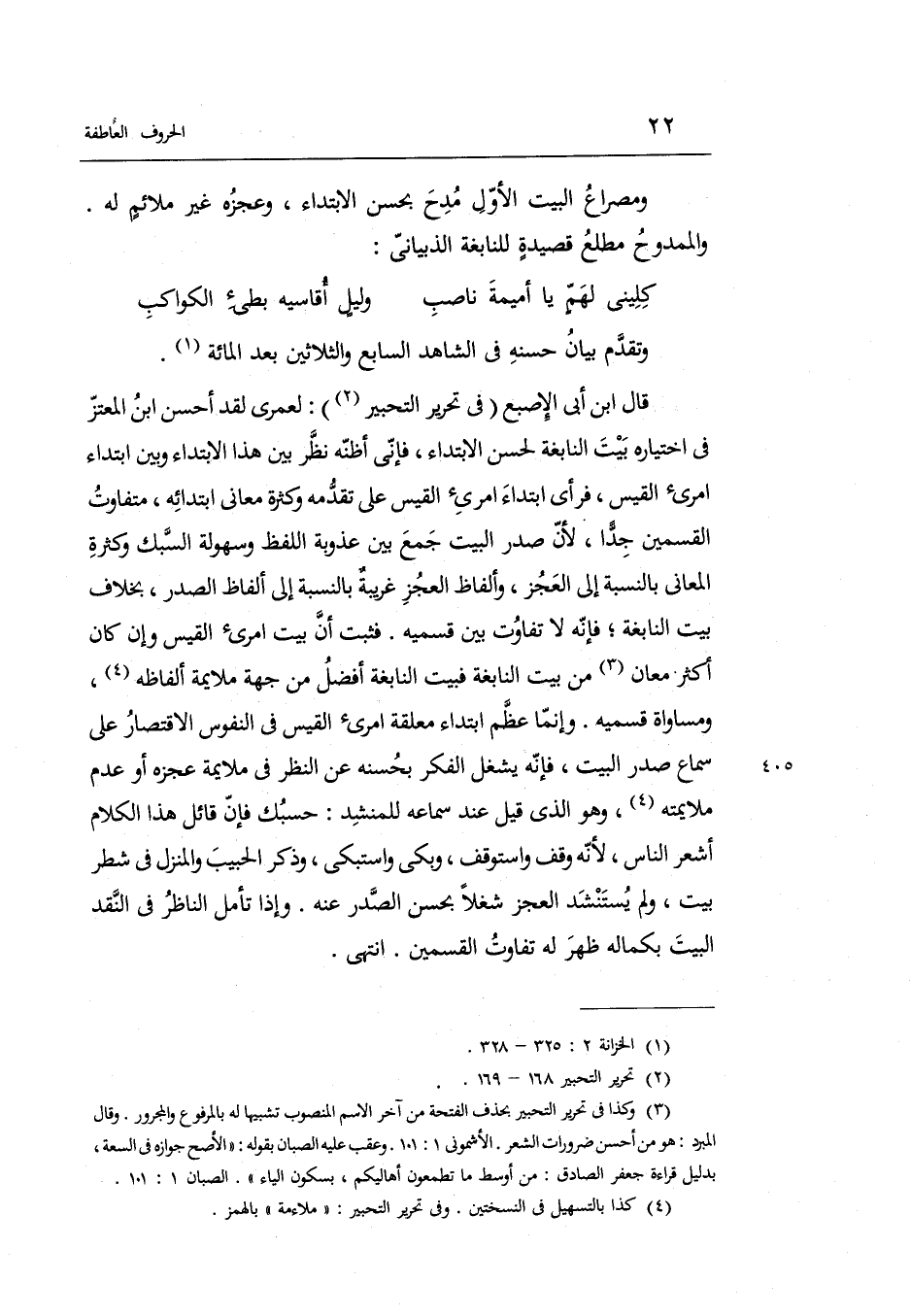 قَالَ ابْن أبي الإصبع فِي تَحْرِير التحبير: لعمري لقد أحسن ابْن المعتز فِي اخْتِيَاره بَيت النَّابِغَة لحسن الِابْتِدَاء فَإِنِّي أظنّه نظّر بَين هَذَا الِابْتِدَاء وَبَين ابْتِدَاء امرىء الْقَيْس فَرَأى ابْتِدَاء امرىء الْقَيْس على تقدّمه وَكَثْرَة مَعَاني ابْتِدَائه متفاوت الْقسمَيْنِ جدا لِأَن صدر الْبَيْت جمع بَين عذوبة اللَّفْظ وسهولة السّبك وَكَثْرَة الْمعَانِي بِالنِّسْبَةِ إِلَى الْعَجز وألفاظ الْعَجز غَرِيبَة بِالنِّسْبَةِ إِلَى فَثَبت أنّ بَيت امرىء الْقَيْس وَإِن كَانَ أَكثر معَان من بَيت النَّابِغَة فبيت النَّابِغَة أفضل من جِهَة ملايمة أَلْفَاظه ومساواة قسميه.