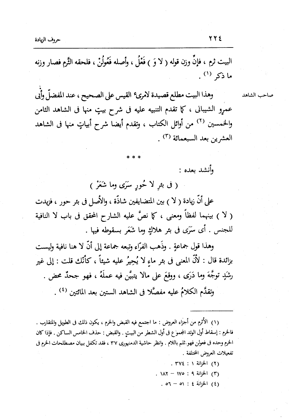 فِي بِئْر لَا حورٍ سرى وَمَا شعر على أَن زِيَادَة لَا بَين المتضايفين شَاذَّة وَالْأَصْل: فِي بِئْر حور فزيدت لَا بَينهمَا لفظا وَمعنى كَمَا نَص عَلَيْهِ الشَّارِح الْمُحَقق فِي بَاب لَا النافية للْجِنْس. أَي: سرى فِي بِئْر هلاكٍ وَمَا شعر بسقوطه فِيهَا.