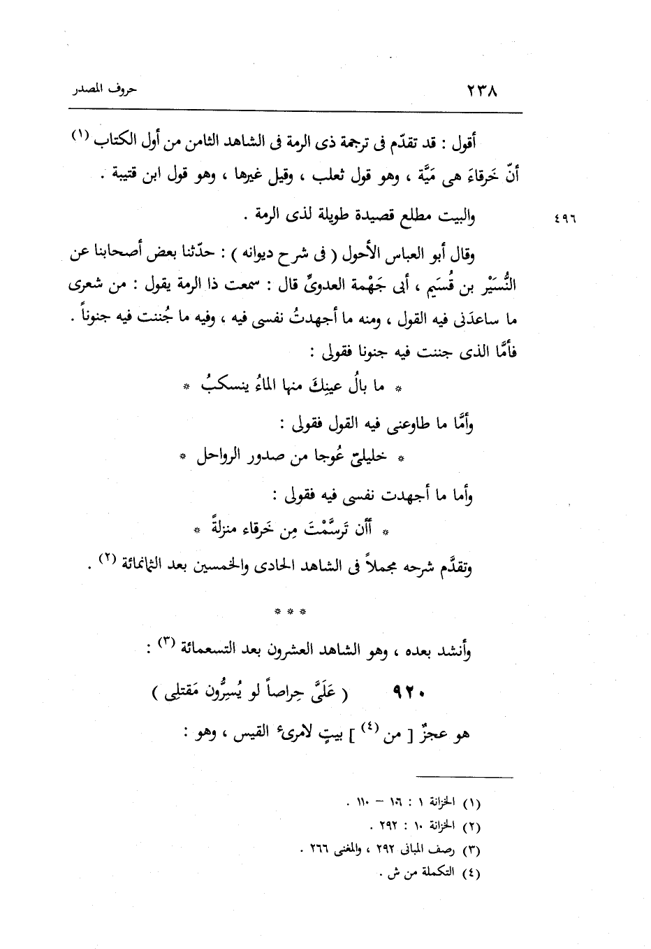 وَقَالَ أَبُو الْعَبَّاس الْأَحول فِي شرح ديوانه: حَدثنَا بعض أَصْحَابنَا عَن النسير ابْن قسيم أبي جهمة الْعَدوي قَالَ: سَمِعت ذَا الرمة يقو ل: من شعري مَا ساعدني فِيهِ القَوْل وَمِنْه مَا أجهدت نَفسِي فِيهِ وَفِيه مَا جننت فِيهِ جنوناً فَأَما الَّذِي جننت فِيهِ جنوناًَ فَقولِي: مَا بَال عَيْنك مِنْهَا المَاء ينسكب)
