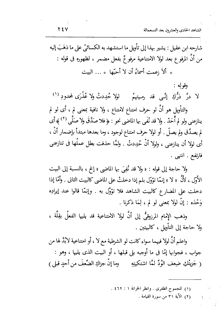 وَلَا حَاجَة إِلَى قَوْله: وَلَا قد نفي بهَا الْمَاضِي ... إِلَخ بِالنِّسْبَةِ إِلَى الْبَيْت الأول لِأَن لَا إِنَّمَا تؤول بلم إِذا دخلت على الْمَاضِي كالبيت الثَّانِي. وَأما إِذا دخلت على الْمُضَارع كالبيت الشَّاهِد فَلَا تؤول بِهِ. وَإِنَّمَا قَالُوا عِنْد إِيرَاده وَحده: إِن لَوْلَا بِمَعْنى لَو لم لما ذكرنَا.