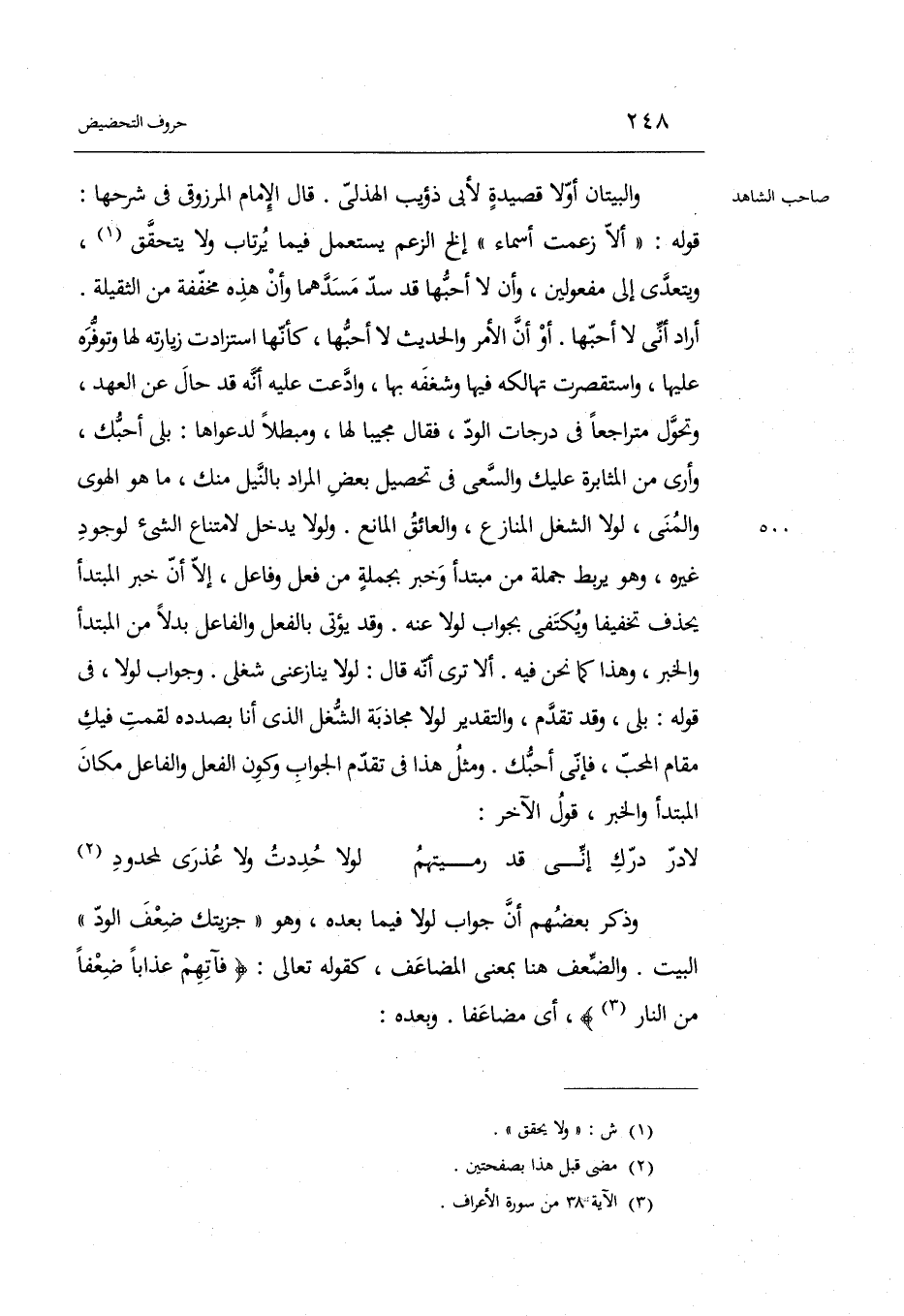 وَجَوَاب لَوْلَا فِي قَوْله: بلَى وَقد تقدم وَالتَّقْدِير: لَوْلَا مجاذبة الشّغل الَّذِي أَنا بصدده لقمت فِيك مقَام الْمُحب فَإِنِّي أحبك. وَمثل هَذَا فِي تقدم الْجَواب وَكَون الْفِعْل وَالْفَاعِل مَكَان الْمُبْتَدَأ وَالْخَبَر قَول الآخر: الْبَسِيط وَذكر بَعضهم أَن جَوَاب لَوْلَا فِيمَا بعده وَهُوَ: جزيتك ضعف الود الْبَيْت. والضعف هُنَا بِمَعْنى المضاعف كَقَوْلِه تَعَالَى: فآتهم عذَابا ضعفا من النَّار أَي: مضاعفاً.