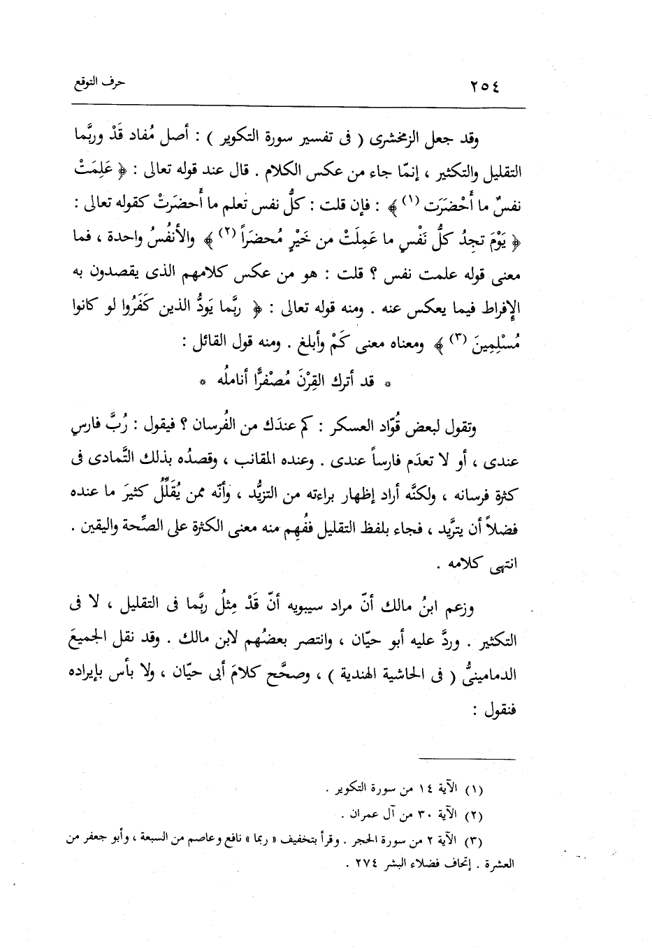 وَقد جعل الزَّمَخْشَرِيّ فِي تَفْسِير سُورَة التكوير: أصل مفَاد قد وربّما التقليل والتكثير إِنَّمَا جَاءَ من عكس الْكَلَام. قَالَ عِنْد قَوْله تَعَالَى: علمت نفسٌ مَا أحضرت قَالَ: فَإِن قلت: كلّ نفس تعلم مَا أحضرت كَقَوْلِه تَعَالَى: يَوْم تَجِد كلّ نفسٍ مَا عملت من خيرٍ محضراً والأنفس وَاحِدَة فَمَا معنى قَوْله: علمت نفس قلت: هُوَ من عكس كَلَامهم الَّذِي يقصدون بِهِ الإفراط فِيمَا يعكس عَنهُ. وَمِنْه قَوْله تَعَالَى: رُبمَا يودّ الَّذين كفرُوا لَو كَانُوا مُسلمين وَمَعْنَاهُ معنى كم وأبلغ.)