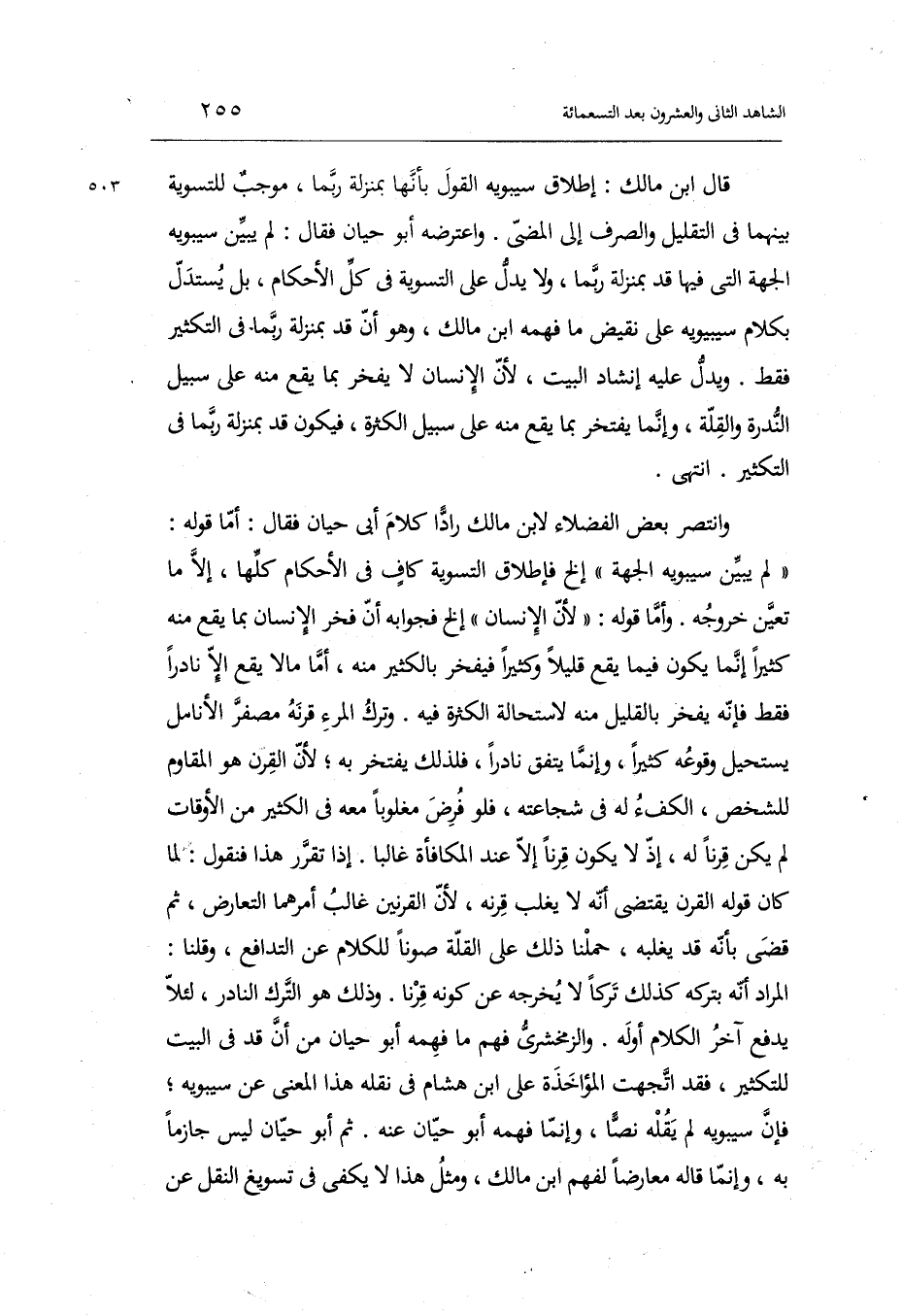 وانتصر بعض الْفُضَلَاء لِابْنِ مَالك رادّاً كَلَام أبي حَيَّان فَقَالَ: أما قَوْله: لم يبين سِيبَوَيْهٍ الْجِهَة ... إِلَخ فإطلاق التَّسْوِيَة كافٍ فِي الْأَحْكَام كلهَا إِلَّا مَا تعين خُرُوجه.