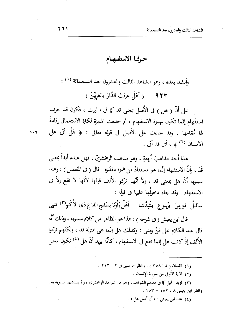 الرجز أهل عرفت الدَّار بالغريين على أَن هَل فِي الأَصْل بِمَعْنى قد كَمَا فِي الْبَيْت فكون قد حرف اسْتِفْهَام إِنَّمَا تكون بِهَمْزَة الِاسْتِفْهَام ثمَّ حذفت الْهمزَة لِكَثْرَة الِاسْتِعْمَال إِقَامَة لَهَا مقَامهَا. وَقد جَاءَت على اللأصل فِي قَوْله تَعَالَى: هَل أَتَى على الْإِنْسَان أَي: قد أَتَى.