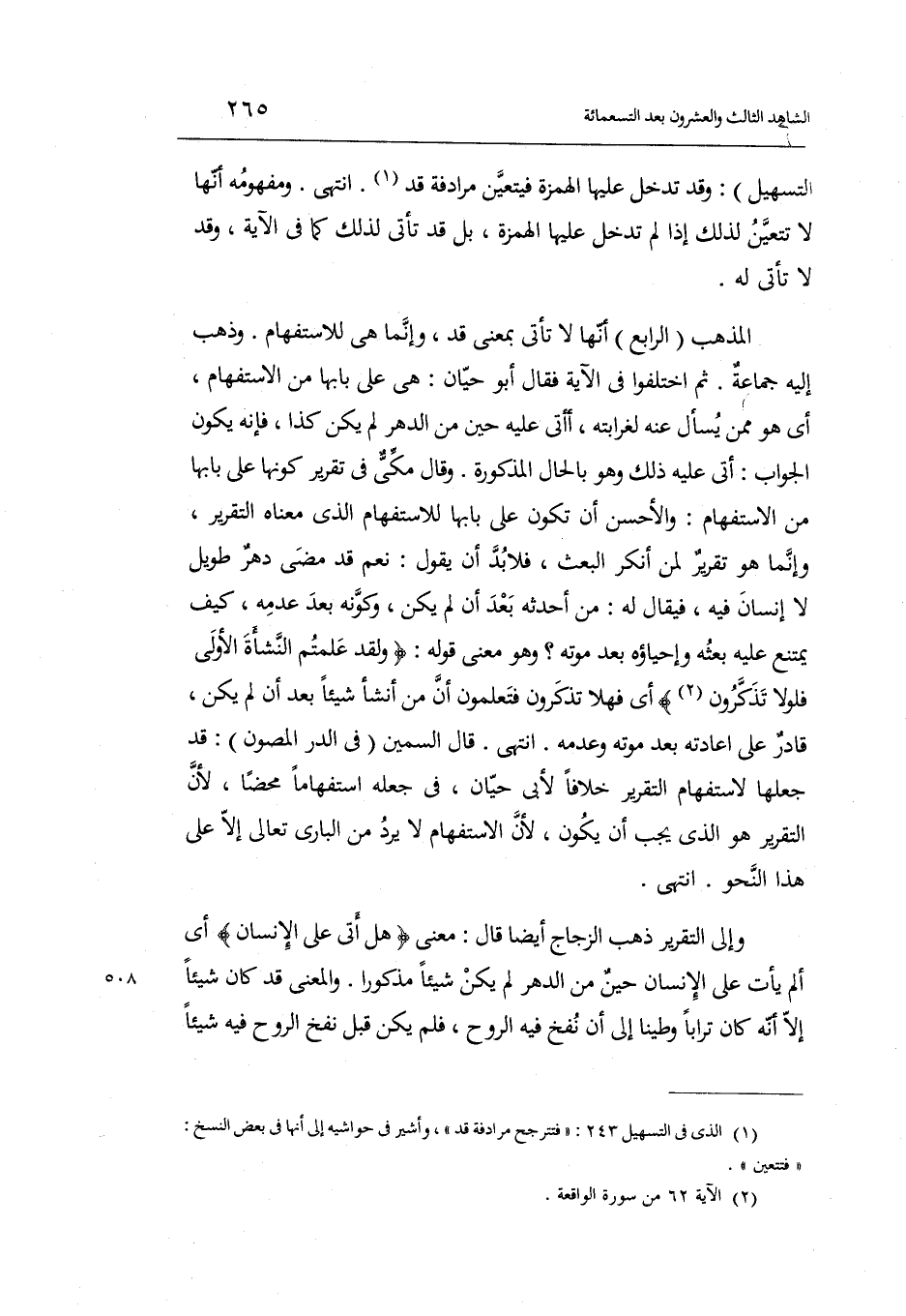 وَقَالَ مكي فِي تَقْرِير كَونهَا على بَابهَا من الِاسْتِفْهَام: وَالْأَحْسَن أَن تكون على بَابهَا للاستفهام الَّذِي مَعْنَاهُ التَّقْرِير وَإِنَّمَا هُوَ تَقْرِير لمن أنكر الْبَعْث فَلَا بُد أَن يَقُول: نعم قد مضى دهراً طَوِيل لَا إِنْسَان فِيهِ فَيُقَال لَهُ: من أحدثه بعد أَن يكن وَكَونه بعد عَدمه كَيفَ يمْتَنع عَلَيْهِ بَعثه وإحياؤه بعد مَوته هُوَ معنى قَوْله: وَلَقَد علمْتُم النشأة الأولى فَلَولَا تذكرُونَ أَي: فَهَلا تذكرُونَ فتعلمون أَن من أنشأ شَيْئا بعد أَن لم يكن قَادر على أعادته بعد مَوته وَعَدَمه. انْتهى.