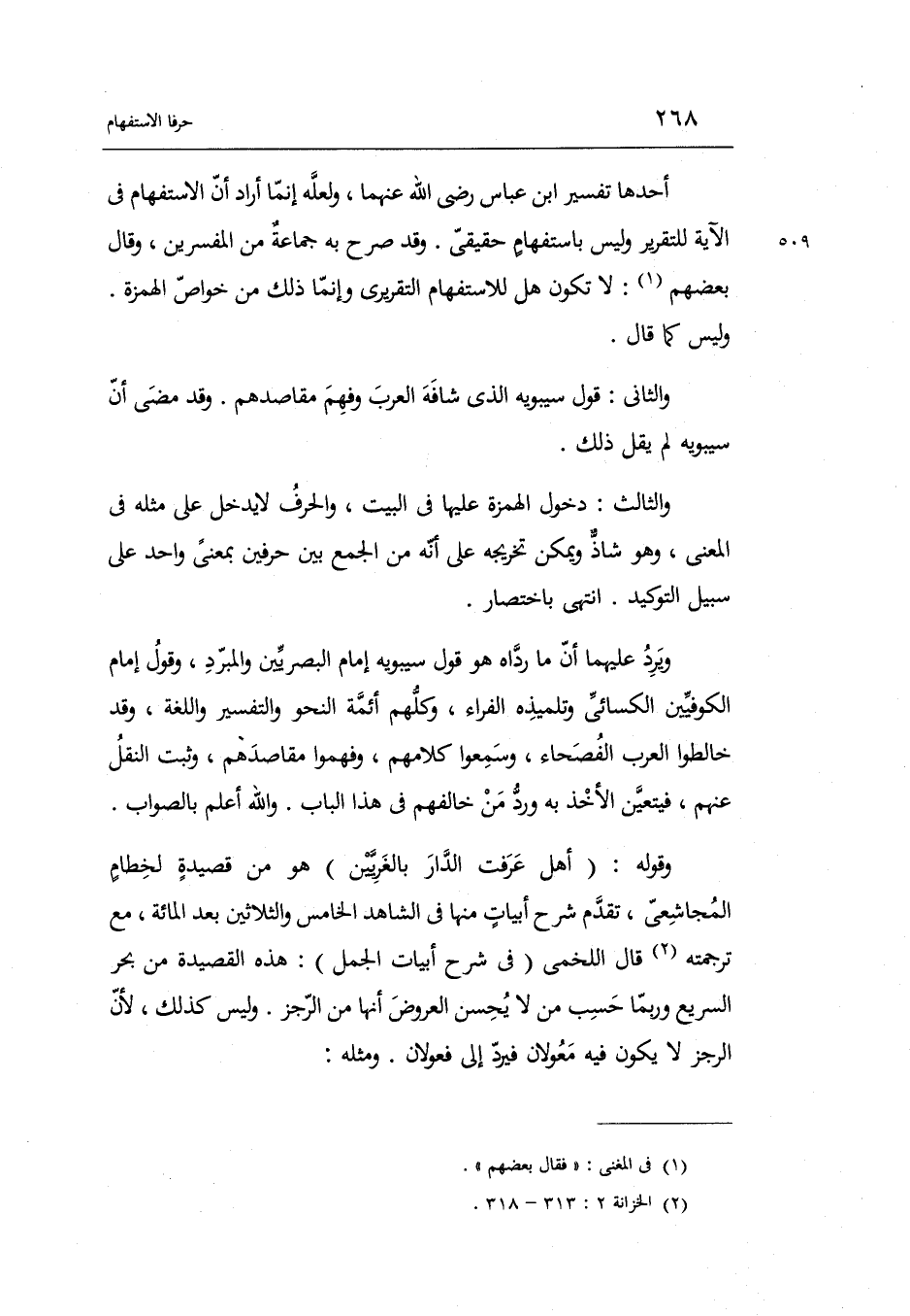 وَالثَّانِي: قَول سِيبَوَيْهٍ الَّذِي شافه الْعَرَب وَفهم مقاصدهم. وَقد مضى أَن سِيبَوَيْهٍ لم يقل ذَلِك.