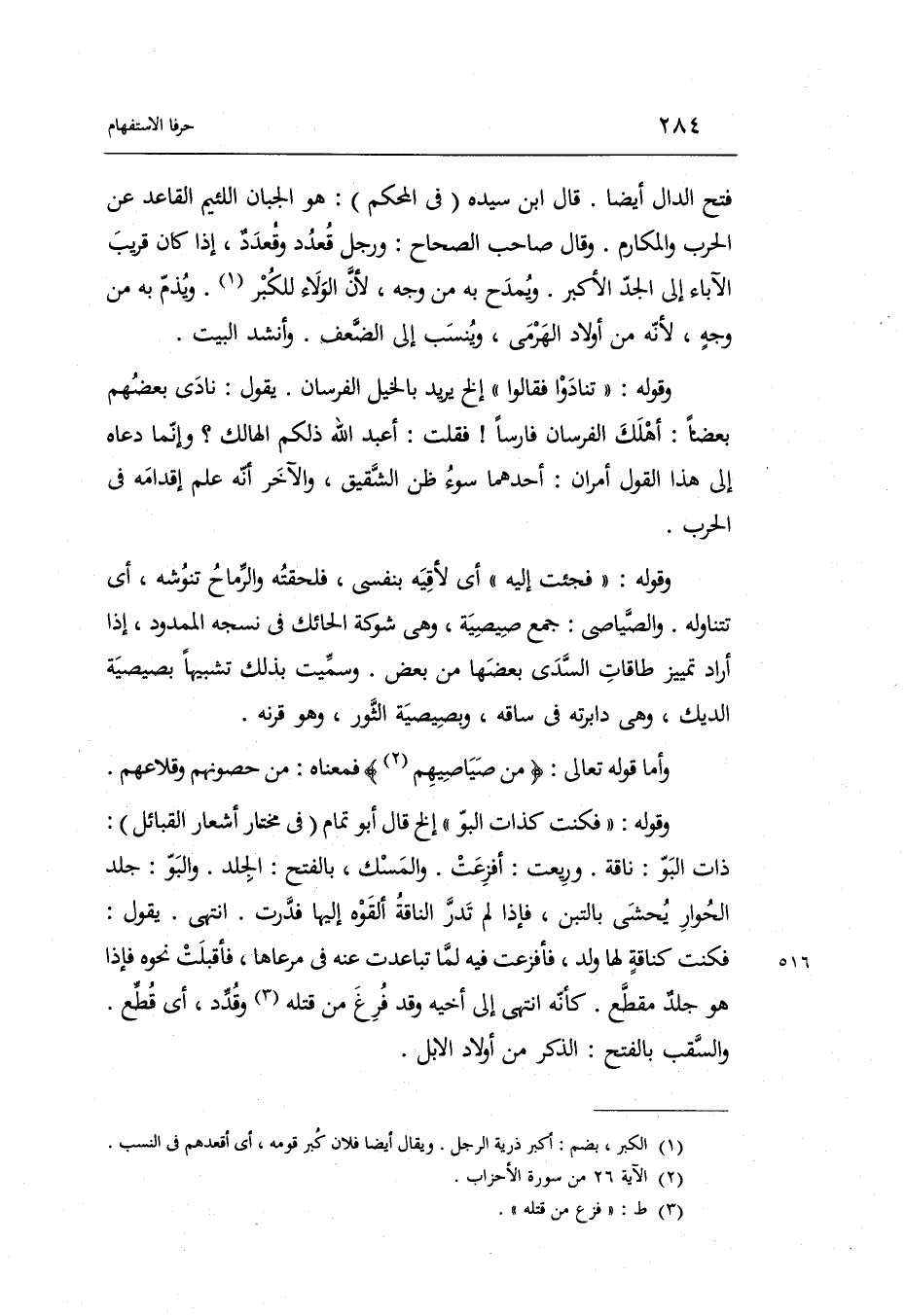 وَأما قَوْله تَعَالَى: من صياصيهم فَمَعْنَاه: من حصونهم وقلاعهم وَقَوله: فَكنت كذات البو ... إِلَخ قَالَ أَبُو تَمام فِي مُخْتَار أشعار الْقَبَائِل: ذَات البو: نَاقَة.