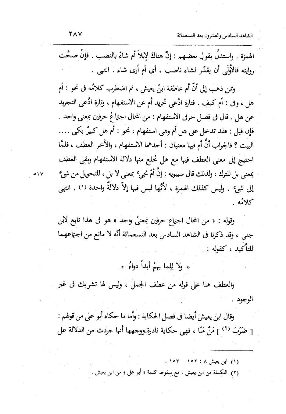 وَقَوله: من الْمحَال اجْتِمَاع حرفين بِمَعْنى وَاحِد هُوَ فِي هَذَا تَابع لِابْنِ جني وَقد ذكرنَا فِي الشَّاهِد السَّادِس بعد التسْعمائَة: أَنه لَا مَانع من اجْتِمَاعهمَا للتَّأْكِيد كَقَوْلِه: وَلَا للما بهم أبدا دَوَاء والعطف هُنَا على قَوْله من عطف الْجمل وَلَيْسَ لَهَا تشريك فِي غير الْوُجُود.