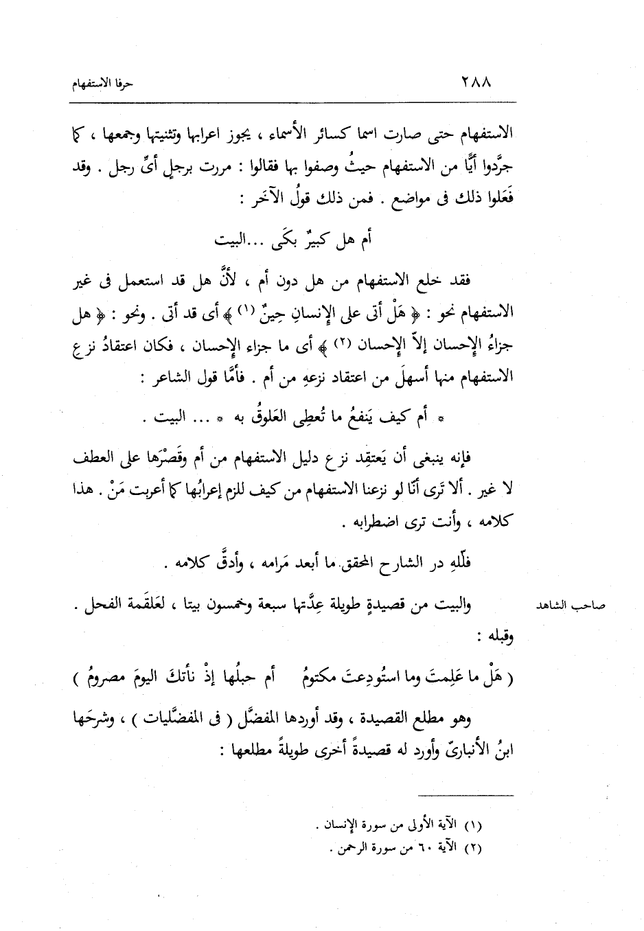 فَمن ذَلِك قَول الآخر: أم هَل كبيرٌ بَكَى ... . . الْبَيْت فقد خلع الِاسْتِفْهَام من هَل دون أم لِأَن هَل قد اسْتعْمل فِي غير الِاسْتِفْهَام نَحْو: هَل أَتَى على الْإِنْسَان حينٌ أَي: قد أَتَى. وَنَحْو: هَل جَزَاء الْإِحْسَان إِلَّا الْإِحْسَان أَي مَا جَزَاء الْإِحْسَان فَكَانَ اعْتِقَاد نزع الِاسْتِفْهَام مِنْهَا أسهل من اعْتِقَاد نَزعه من أم.