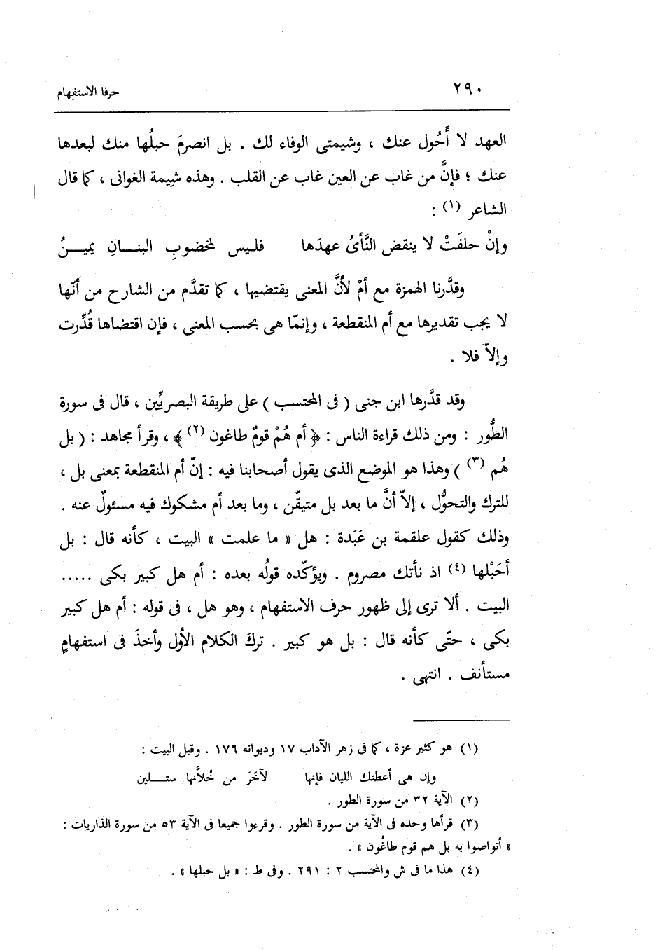 وقدرنا الْهمزَة مَعَ أم لِأَن الْمَعْنى يقتضيها كَمَا تقدم من الشَّارِح من أَنَّهَا لَا يجب تقديرها مَعَ أم وَقد قدرهَا ابْن جني فِي الْمُحْتَسب على طَريقَة الْبَصرِيين قَالَ فِي سُورَة الطّور: وَمن ذَلِك قِرَاءَة النَّاس: أم هم قومٌ طاغون وَقَرَأَ مُجَاهِد: بل هم وَهَذَا هُوَ الْموضع الَّذِي يَقُول أَصْحَابنَا فِيهِ: إِن أم المنقطعة بِمَعْنى بل للترك والتحول إِلَّا أَن مَا بعد بل مُتَيَقن وَمَا بعد أم مَشْكُوك فِيهِ مسؤول عَنهُ. وَذَلِكَ كَقَوْل عَلْقَمَة بن عَبدة: هَل مَا علمت الْبَيْت كَأَنَّهُ قَالَ: بل أحبلها إِذْ نأتك مصروم.