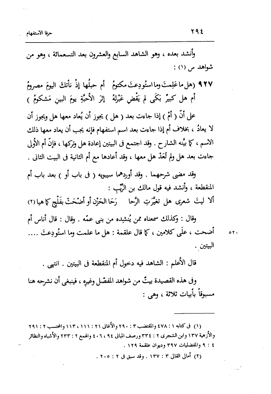 وَقد اجْتمع فِي الْبَيْتَيْنِ إِعَادَة هَل وَتركهَا فَإِن أم الأولى جَاءَت بعد هَل وَلم تعد هَل مَعهَا وَقد أَعَادَهَا مَعَ أم الثَّانِيَة فِي الْبَيْت الثَّانِي.