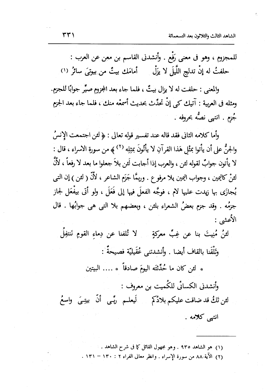 فألغى جَوَاب الْيَمين من الْفِعْل وَكَانَ الْوَجْه فِي الْكَلَام أَن يَقُول: لَئِن كَانَ كَذَا لآتينك وتوهم إِلْغَاء اللَّام كَمَا قَالَ الآخر: الطَّوِيل
