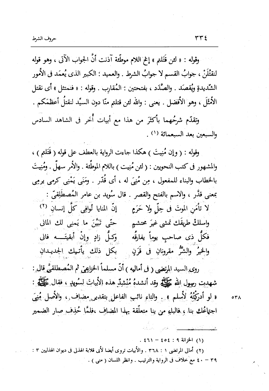 وَبعد فَلَا يخفى على النَّاظر وَجه الصَّوَاب. فالوقوف مَعَ مَا ورد عَن الْعَرَب حَيْثُ لَا مَانع يمْنَع من الْحمل على ظَاهر مَا ورد عَنْهُم. انْتهى كَلَام نَاظر الْجَيْش.)