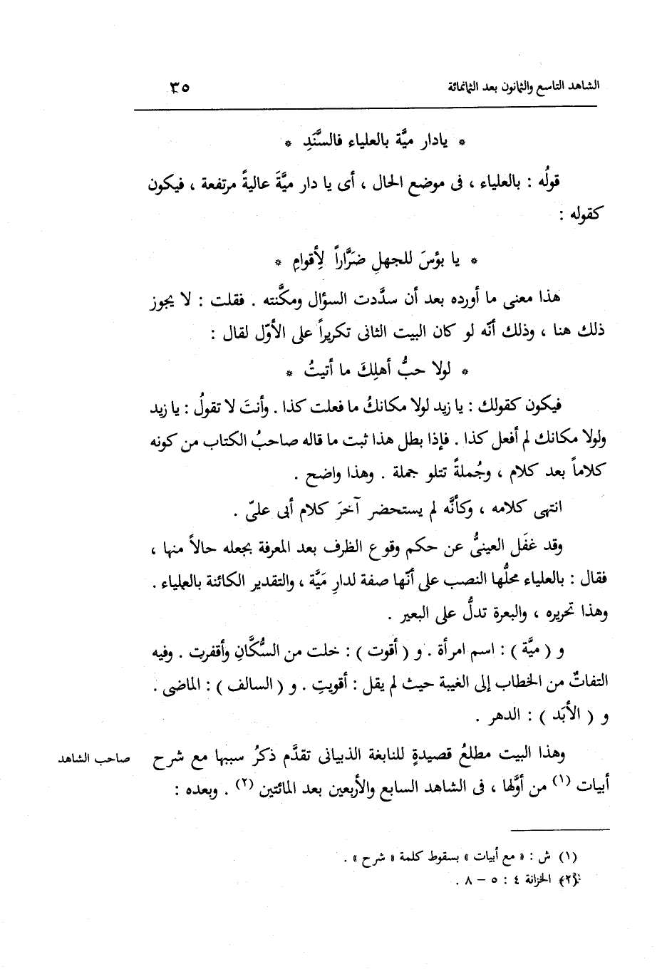 قَوْله: بالعلياء فِي مَوضِع الْحَال أَي: يَا جَار ميّة عالية مُرْتَفعَة فَيكون كَقَوْلِه: يَا بؤس للْجَهْل ضرّاراً لأقوام هَذَا معنى مَا أوردهُ بعد أَن سدّدت السُّؤَال ومكّنته فَقلت: لايجوز ذَلِك هُنَا وَذَلِكَ أَنه لَو لَوْلَا حبّ أهلك مَا أتيت)
